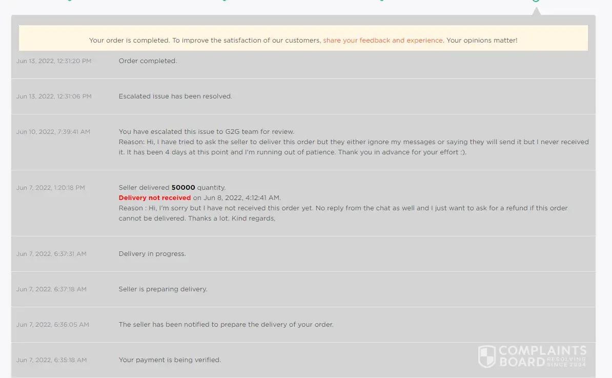 I have ordered some currencies in G2G on the 7th of June 2022. The sellers only delivered 2 out of 3 orders within 24 hours and 1 order never arrived. I tried to contact the seller in the first place and they kept on ignoring my message or telling me that they will deliver the oder. I have warned them that if they don't deliver it, I would have to report it to G2G but despite the warning, the seller never delivered my order. Until the 10th of June, I have enough of it and reported the incomplete order to G2G to have a look at the issue. However, after 3 days, the order was marked as solved / complete (without any reply from G2G or any notifications) even though I have not received any currency I have ordered nor did I get any refund (as I requested in the complaint). I sent a ticket after realizing it but after 3 days, even though it was passed on many employees, no one even bothers to send any replies or updates on my issue. That's why I have decided to reach out to this complaint platform!