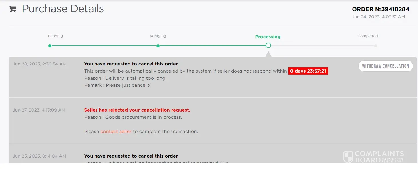 I placed an order for some currency on the 23rd, and typically, it takes only a few hours or a day for them to send it. However, it has now been 5 days, and I have yet to receive anything. To make matters worse, the seller keeps canceling my withdrawal requests, and despite sending numerous emails, they have not resolved the issue.
