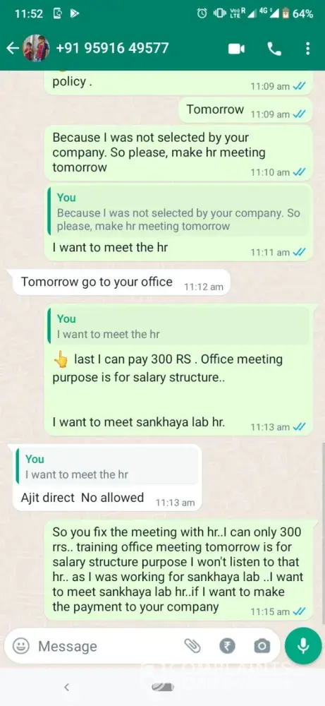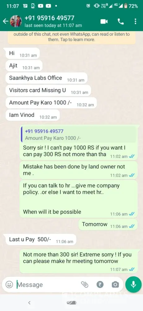 I can only pay 300 RS charges due to. Lost of visitors card untill and unless mr Prakash won't fix the meeting with hr of sankhaya labs.