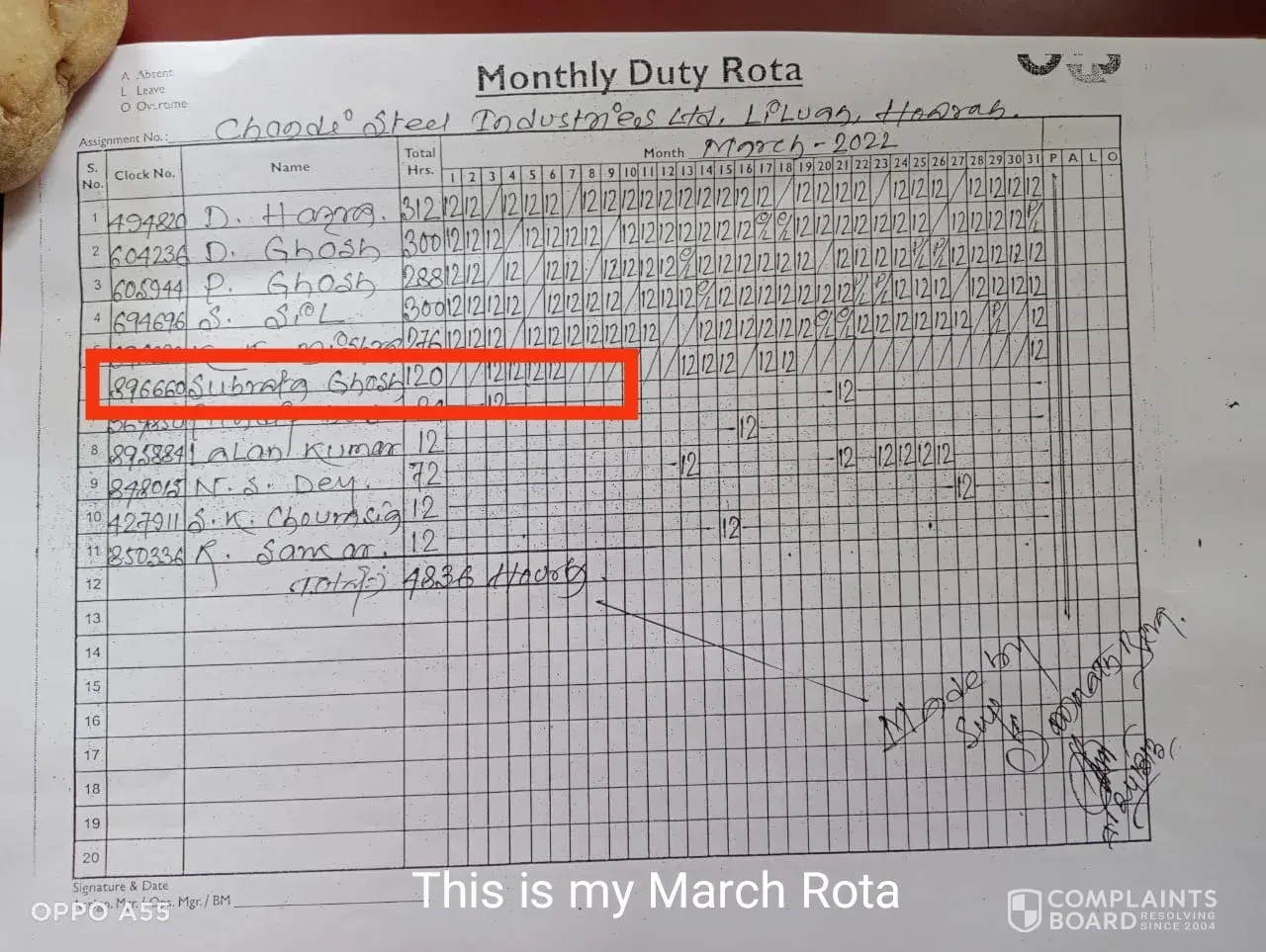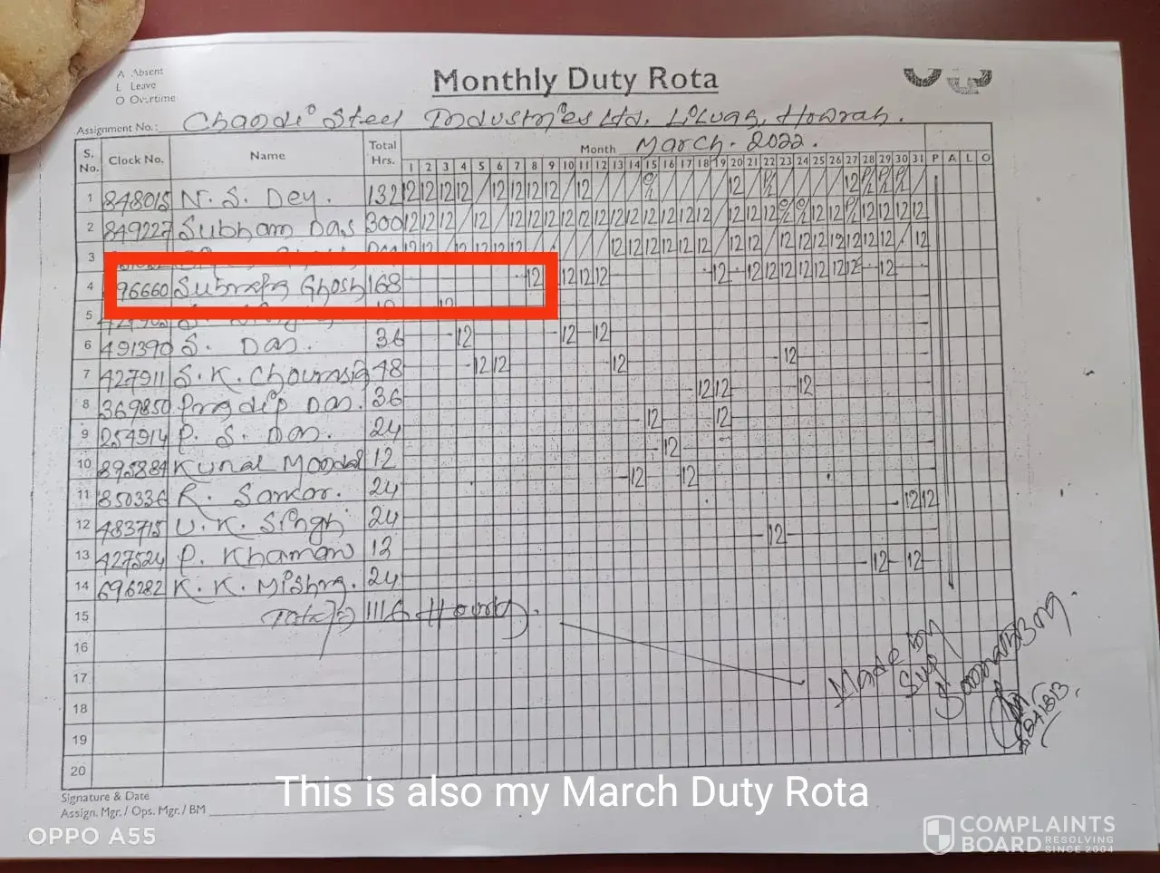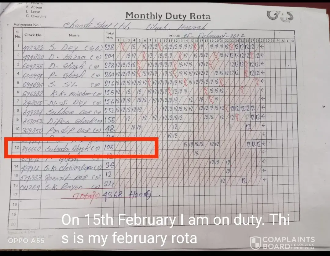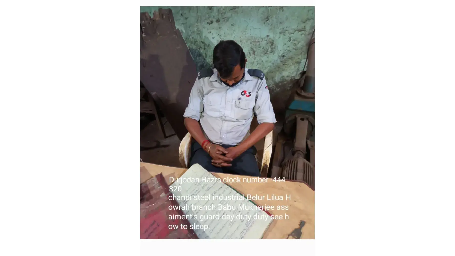 I am Subrata Ghosh g4s pvt. Ltd howrah branch working at Chandi Steel Industrial Belur Lilua Assignment My Clock Number 896660. I join duty on 15th February and do duty till 19th April. I tell New Employee that many old guards like Pintu Patra Clock Number-161620, Durjadan Hajra Clock Number-444820 and Supervisor Somnath Bera Clock Number-241313 always try to feed me case and scold me.I continue my studies by working as a guard in a poor house.From 20th April, my duty supervisor Somnath Bera suddenly stopped my duty with bad report in journal Babu Mukherjee without any proof. My humble submission to you, sir, is that I am completely broken in this situation. If my duty can be resumed and these three are punished then I will be eternally blessed to you.