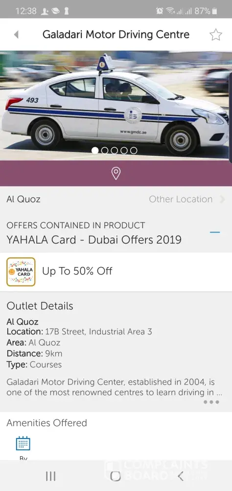 I am writing today to complain of the poor service I received from your company Galadari Driving institute on Sep 17, 2019. I visited your JLT branch in Dubai to register for a car driving course, during the registration process I shared with him my "Yahala Card" confirming to him that we have an agreement with this card under the Prime Minister Office voucher, he insisted that there is not promotion with this card and guided me to go with Groupon and pay 100 AED which I did.
