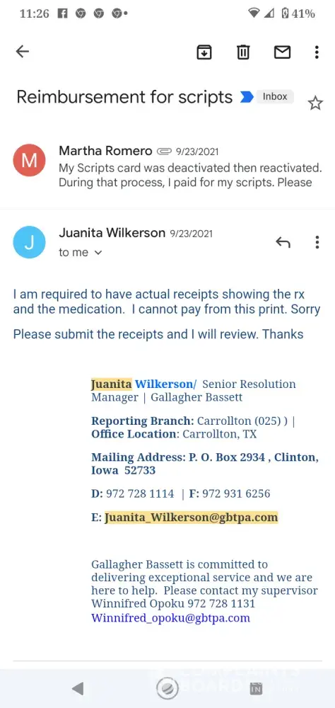 My adjuster at GB has cancelled my first script so I had to pay for my workman's comp meds AND pain Mgmnt. She reimbursed me partially for Dr but said she needed actual receipt for meds. I sent her what I have now she's saying they have to be processed through first script first however-it was cancelled! She restarted first script but won't give me what I had to pay for.