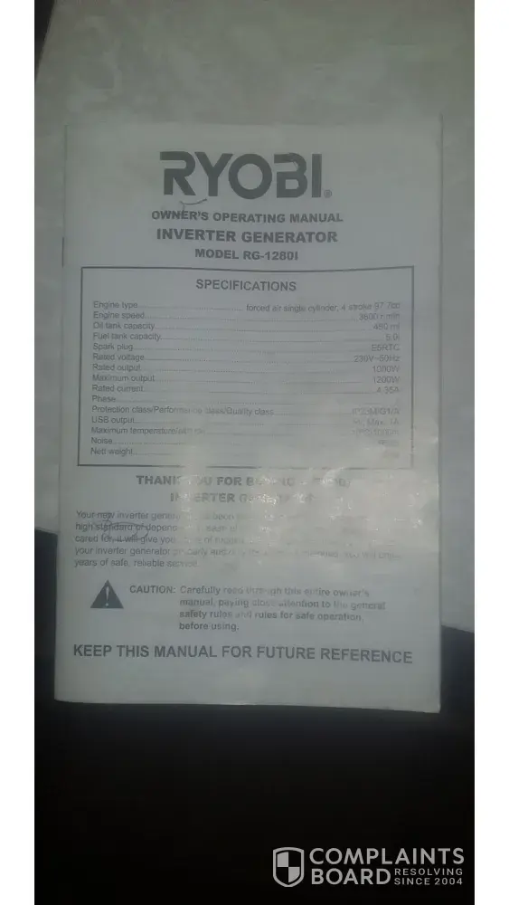 I bought a Ryobi 1200w generator inverter today (26/01/[protected]:34) pm at game. As any customer do you do not open the box in store because you believe that it is the right product and a brand new one as well. I live 320km from the game I bought the product from and when got home I opened the product and guess what? The product has been used before it smells like petrol and when I checked the oil level it is low. There various marks and spots on the product and the exaust outlet you can see that it has been used before. The product manuel has been cut with sisors and has hand writing of a child on it.