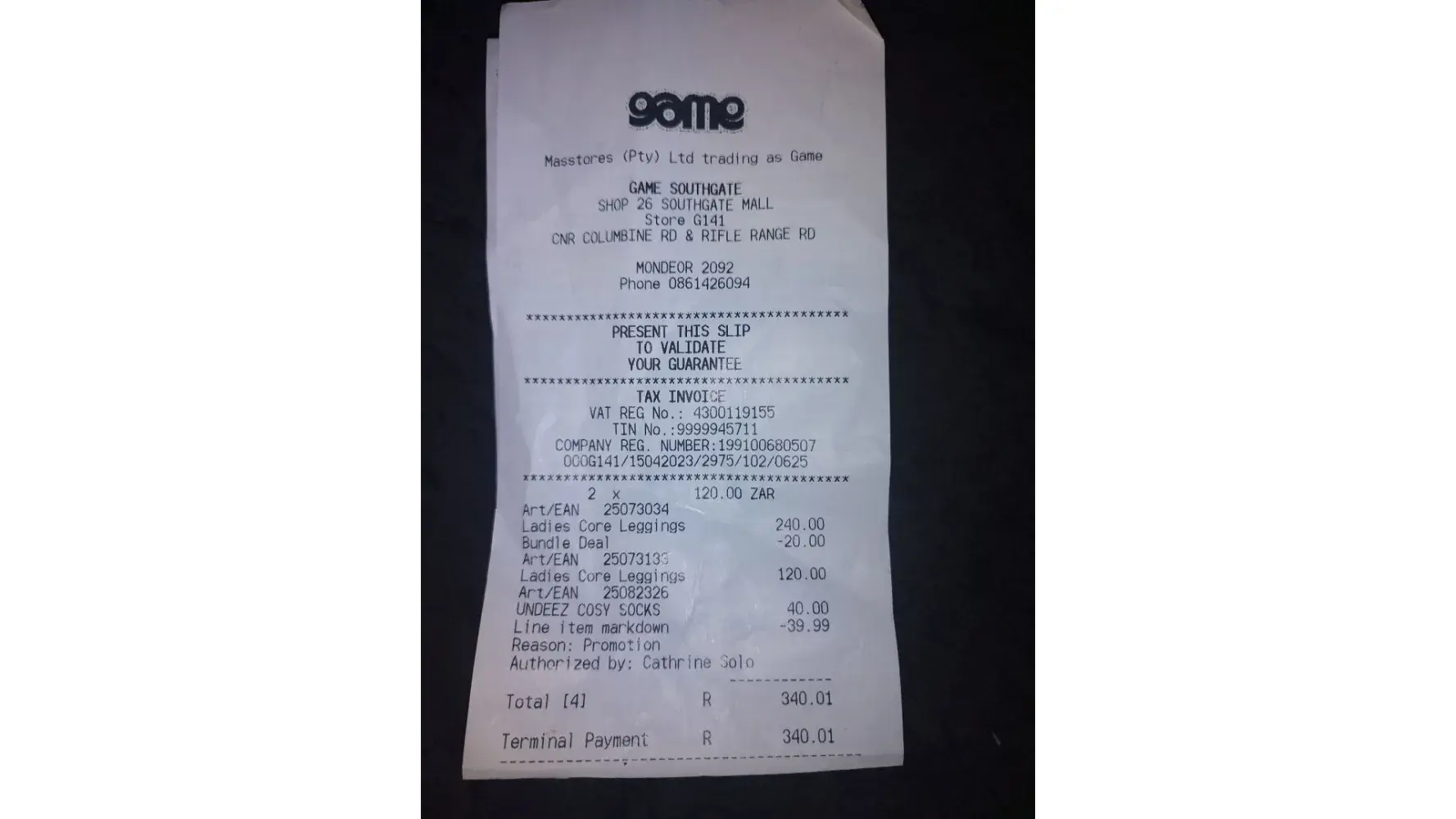 On saturday 15April 2023, I went to game at southgate mall. In the clothing section there was a sign (attached) indicating purchase any3 and get the cheapest 1 free, ofger valid on all clothing and foot wear. Excited I took 3 leggings (picture attached). When I got to the till, it was scanned and the price was R340. When I asked about the special, I was told that I can only get the chepeast clothing item the store sells for free which was a pair of socks (picture attached). This is an extreme form of false advertising and I will be taking further action. Take any 3 and get the cheapest 1 free does not mean that I should get something I did not choose free, it means that the cheapest 1 of the 3 I picked is what I get free. I am disgusted by this false advertising.