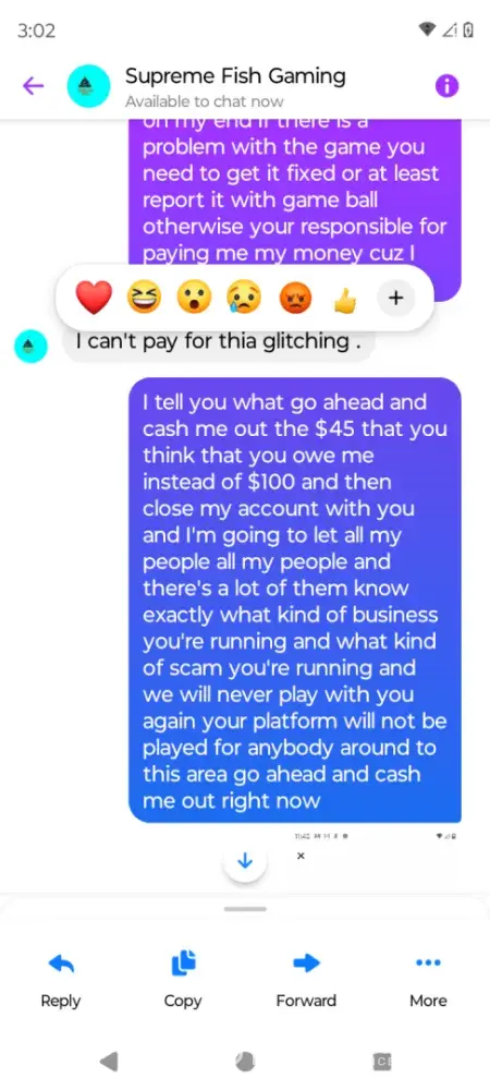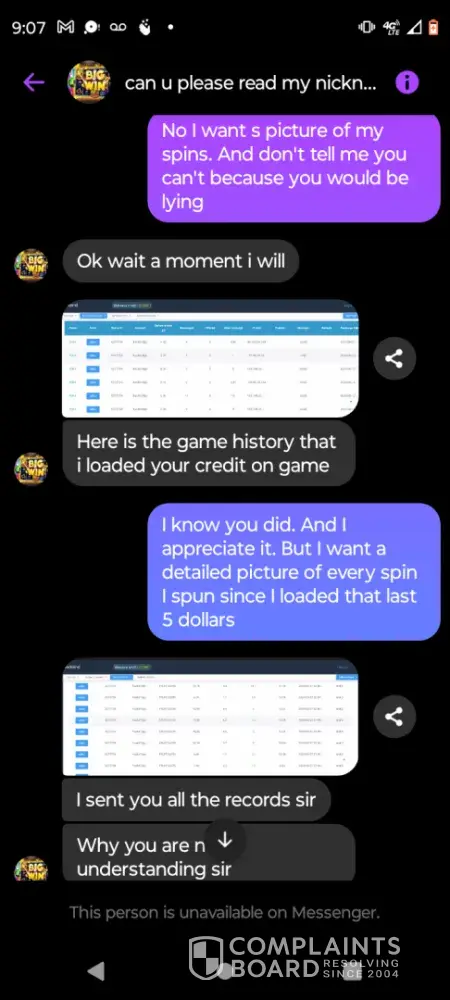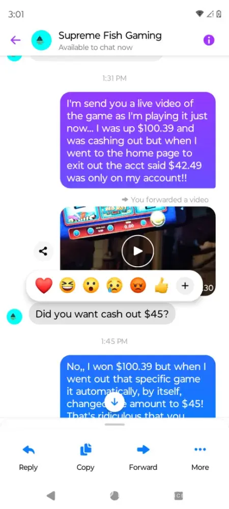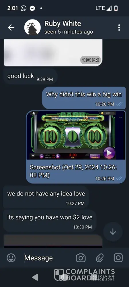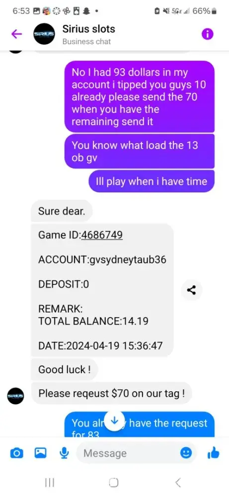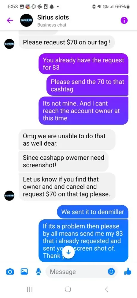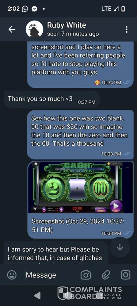 Email [protected]@outlook.com account username sugard729 There’s been multiple times where your games cheated me on wins your new game the Red Hot 7 triple and a few are running into where I was supposed to win but didn’t get paid or I got paid but then later on the ticket away to see if you could complement me with a small bonus bonus will never anymore than $.77 I’ve been playing every single day since I’ve started. My account holder doesn’t offer anything to contact you. You deleted your telegram account for customer service. Honestly, I don’t send that much but I do send every day if you can’t compliment my account with something well that’s just you losing a customer to your platform , thank you for your