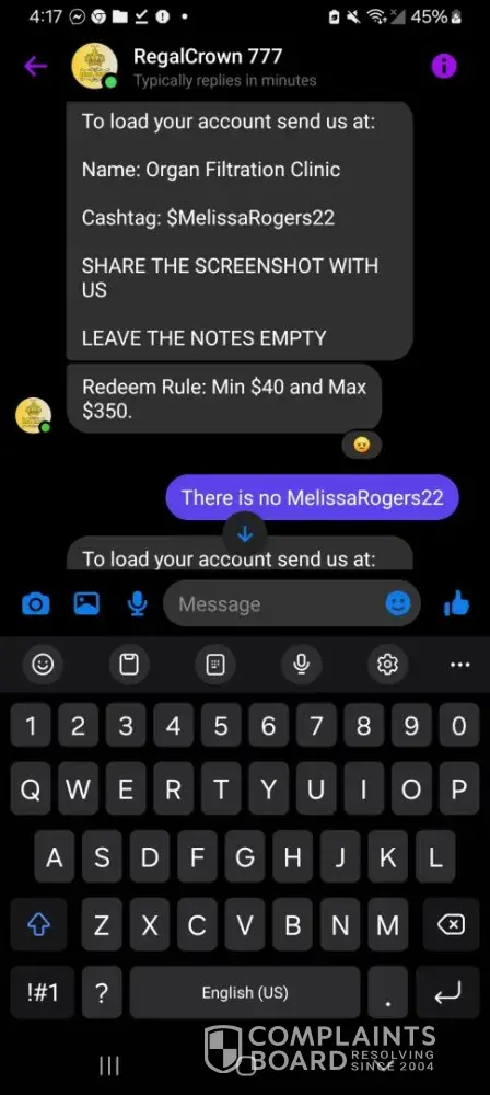 Yeah, I was playing off of Facebook on the user group name a regal Crown 777 and I loaded $15 and I was given $30 as the first time loading bonus period I was told immediately that minimum cash that was 40 I played for about 20 minutes. I asked to crash out at 50 and they told me. I couldn't get their cash out changed to ninety. Once I played a game because...