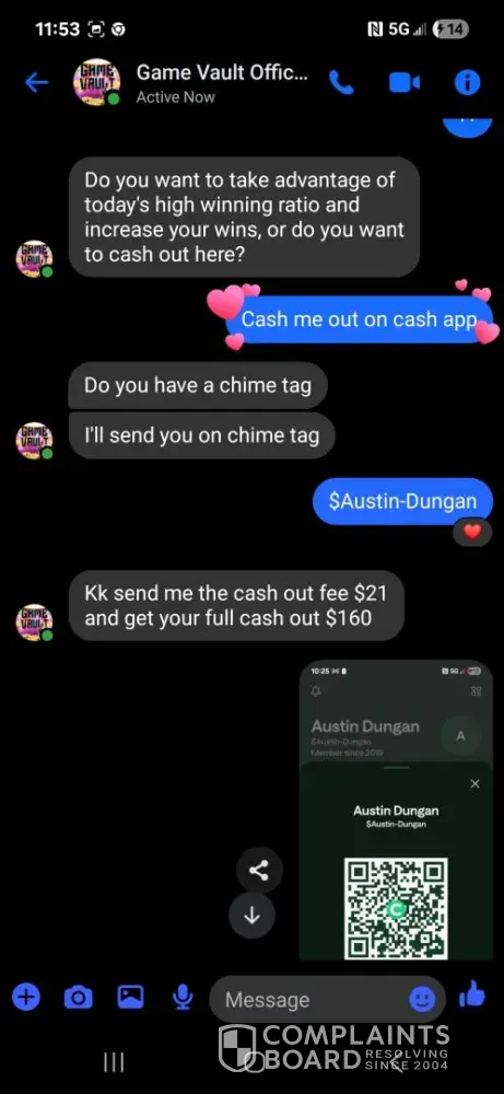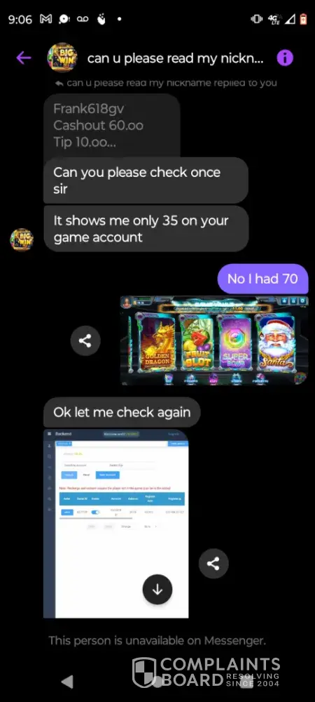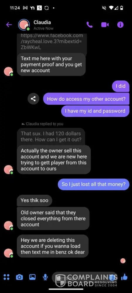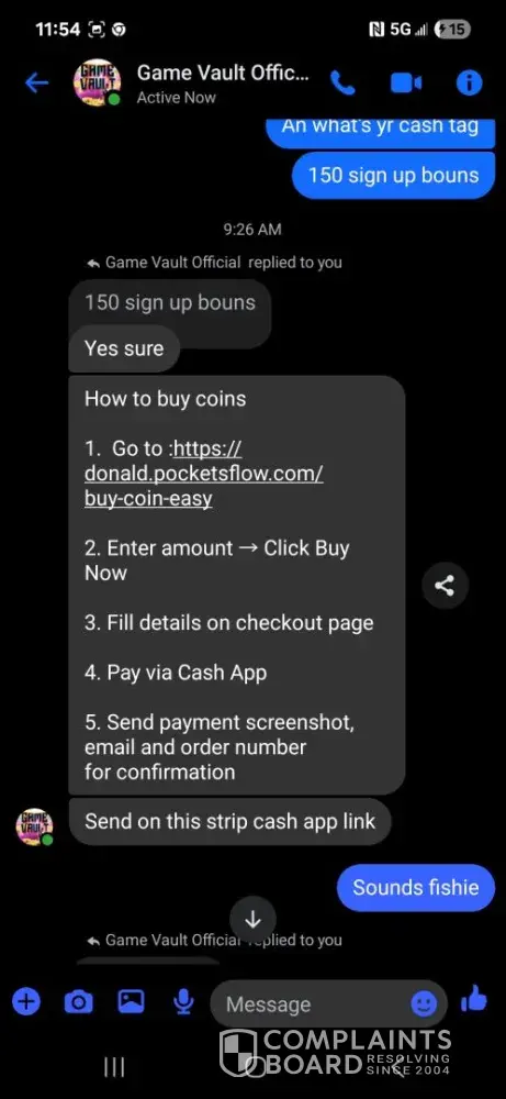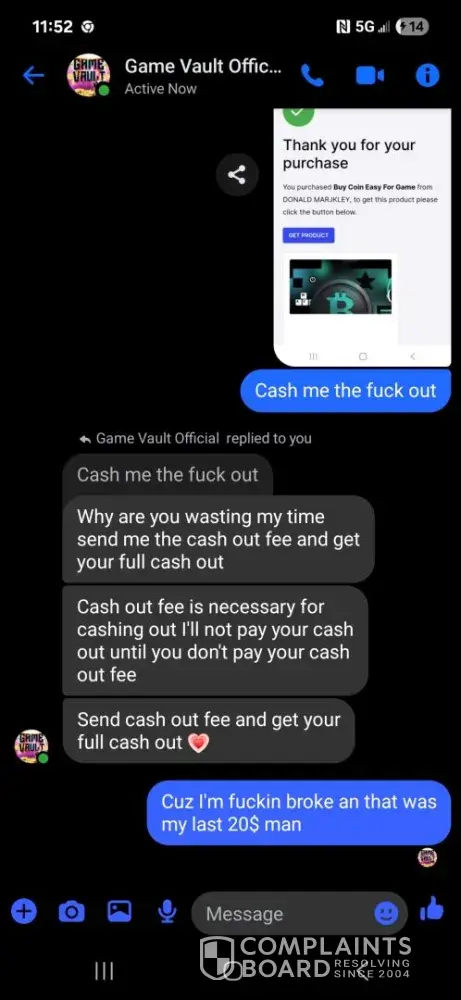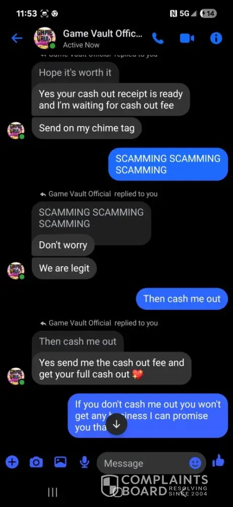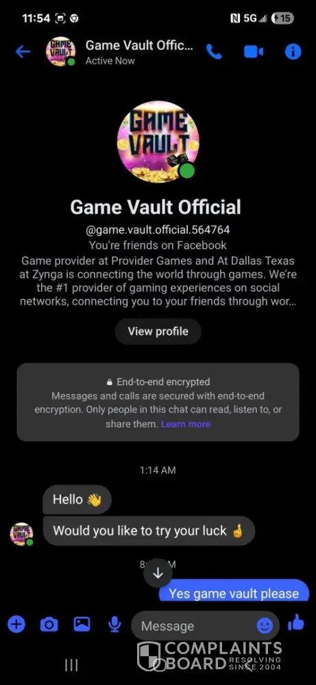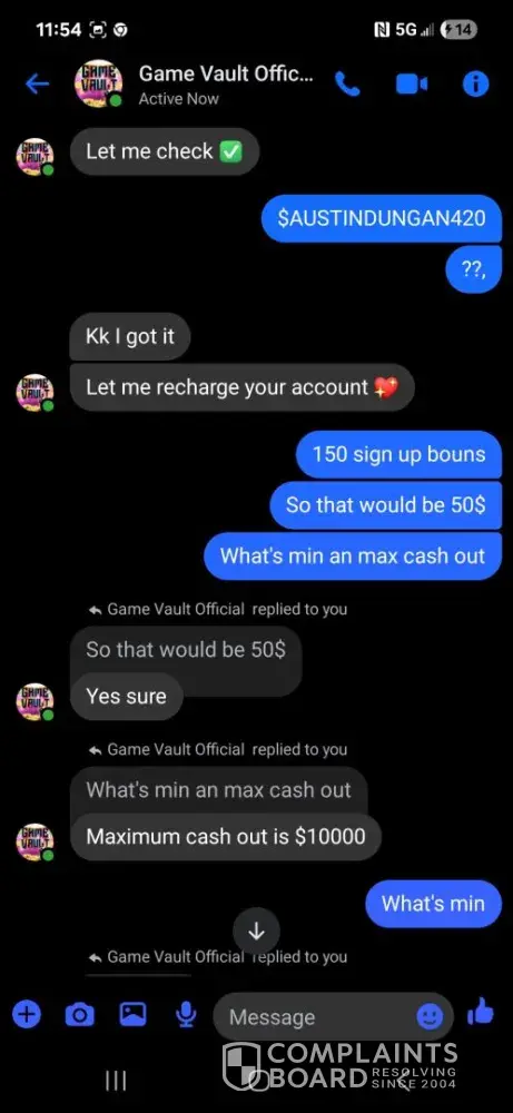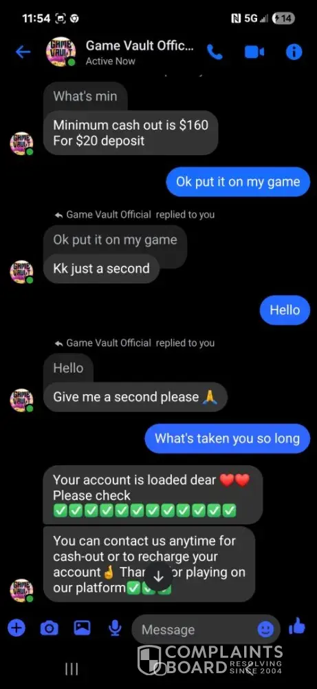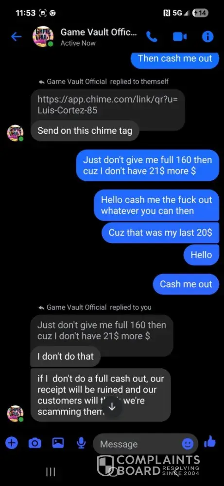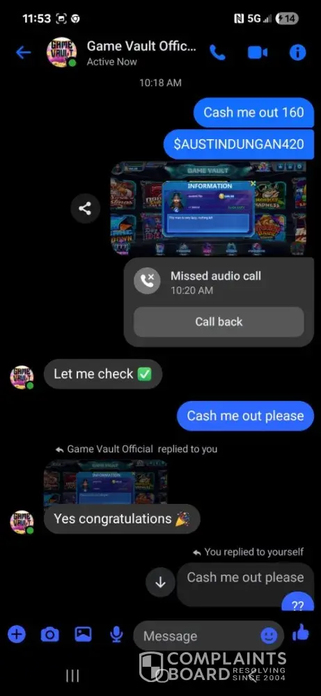 I was playing game vault with a game on fb called Vegas luck they were supposed to cash out 60.69 to me but they rook my money off my game and won’t respond this is there profile link https://www.facebook.com/Thomasshelby.casino?mibextid=AEUHqQ . I have texted them over and over but they won’t answer. I love playing games but feel this is unfair