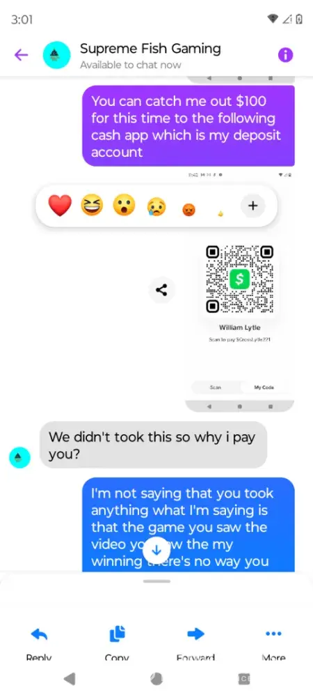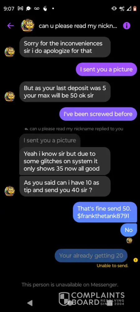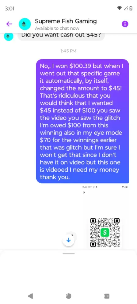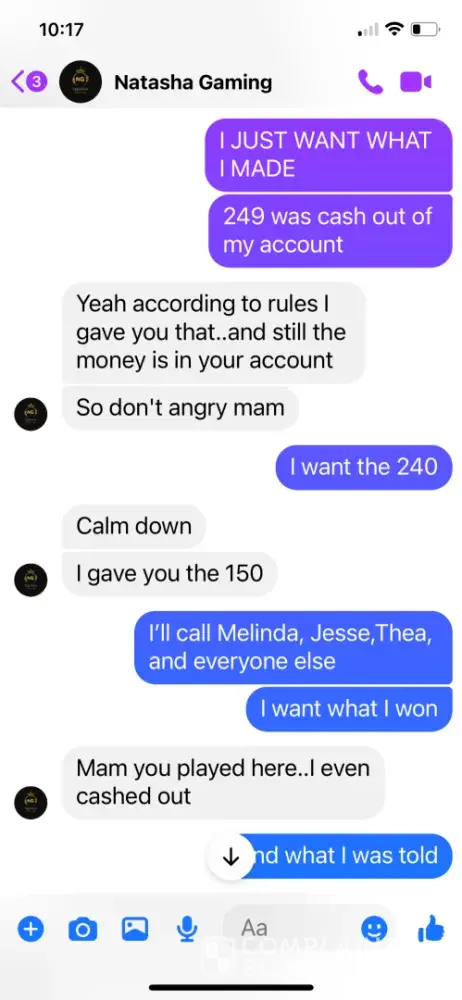 I deposited 5 dollars I won 70 dollars The platform said they only see 35 I sent screenshot of my gamevalt homepage w my game ID and credit amount of 70 They basically called me a liar After about 20 minutes, they messaged and apologized and said they see 70 on my credits. All is good. I deposited 5, so I could only get 50, no problem. Then they asked could they get 10 dollar tip and I said no. At that moment, I was blocked on messenger and Cash App. I have screenshots of the entire conversation