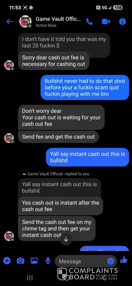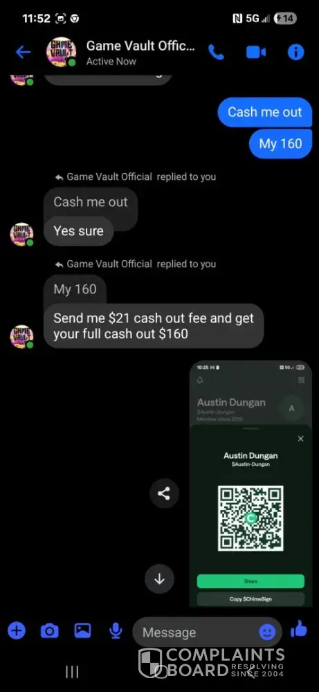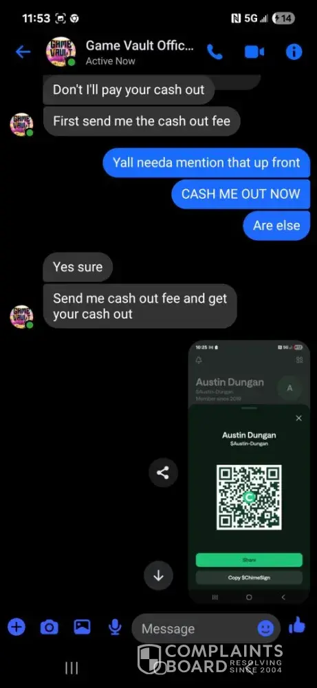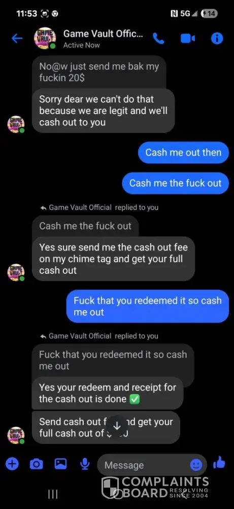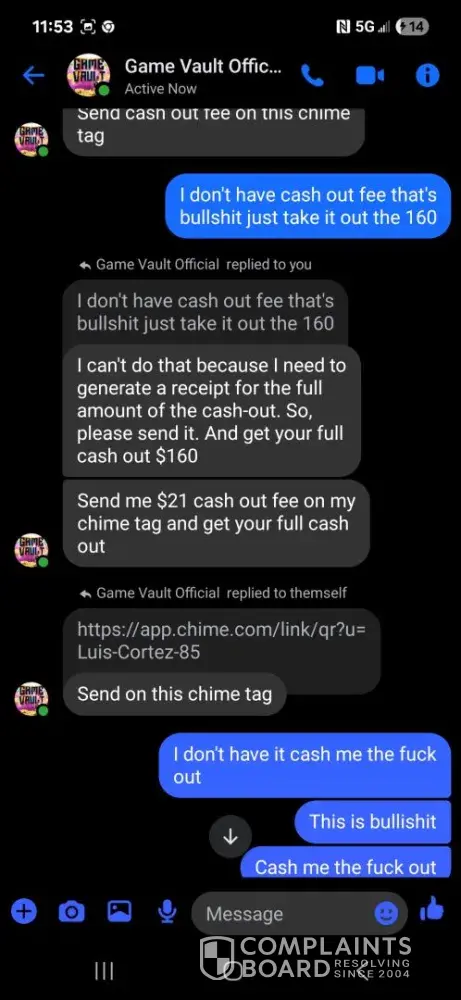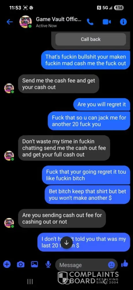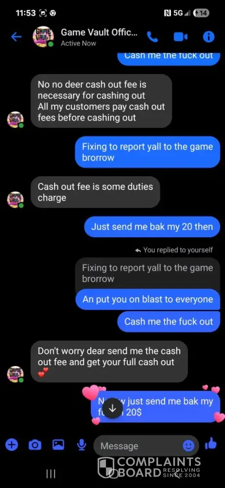 I played Game Vault from a vendor Game Vault who is running your platform hit at $114 went to cash out. You told me I need to send another 20 as a fee to get out the 114 once I did that he took that money as well and has not paid me. He sent vulgar pictures of Porn continues contact me harassing me all my money. I have pictures of all of his texting to me...
