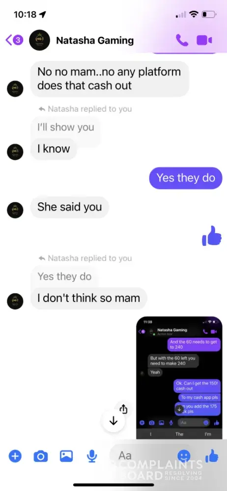 Telling me I have to pay another 21 $ to get cashed out for cash out fees i sent them my last 20$ an now this is want my full cash out of 160 I sent all the screenshots you'll need I've tried to just get them to just refund my 20 $but they refuse to cash me out are refund me I would like to shut down there platform so others don't get scammed like I did thank yall..