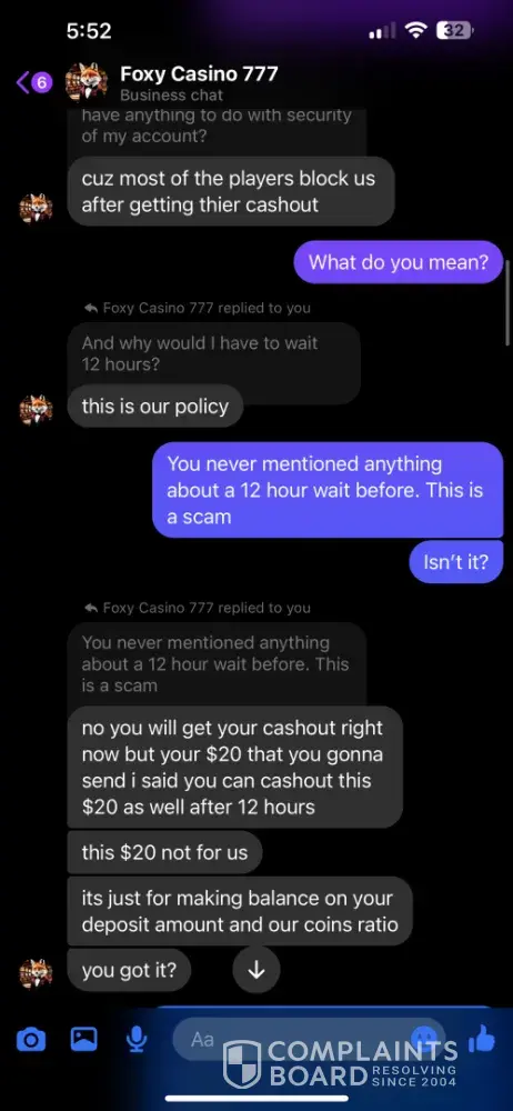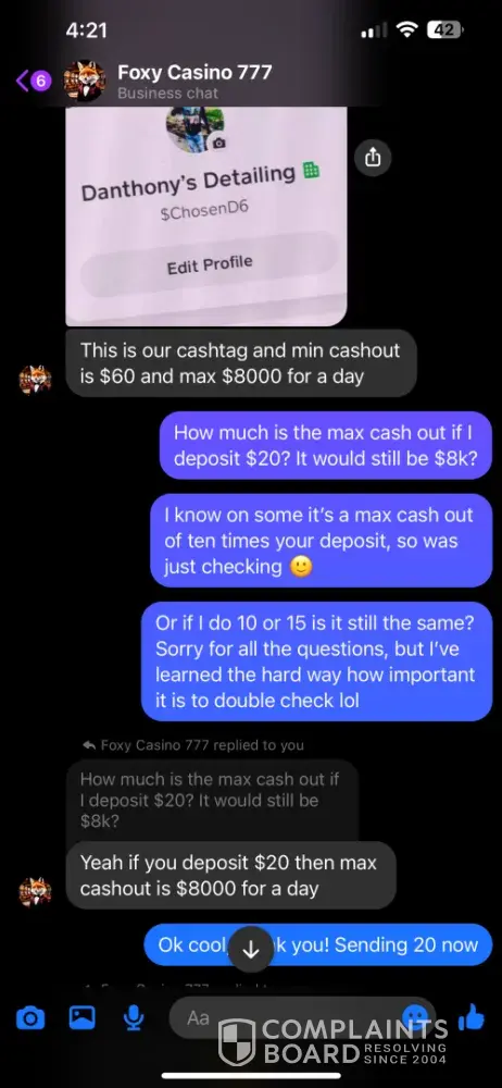 I signed up under Foxy Casino 777 through a Facebook post. I specifically asked for the minimum/maximum cash out amounts and was told 60 minimum/$8k max. I asked for a $20 deposit if it would have the same cash out, but didn’t think to ask about the minimum. So I was at $70 and tried to cash out. I was told the minimum was 120, but if I sent another 20, I could have the 70 and would be able to cash out the 20 within 12 hours. I told them I didn’t understand why I should have to make another deposit, so I tried my luck at reaching the 120 and did. I got it up to $250, which is well over the 120 minimum, I told them I wanted to cash out 120, would do a $60 tip and wished to leave the rest on the game. I was then told again that another deposit was required to receive my cash out. We went back and forth until he agreed to accept the last $3 I had in my cash app, but had to promise to send another $7 when I received the cash out. So I sent it, and still have received nothing. I was told that they were not a platform, but a “family” and that they are not scammers….