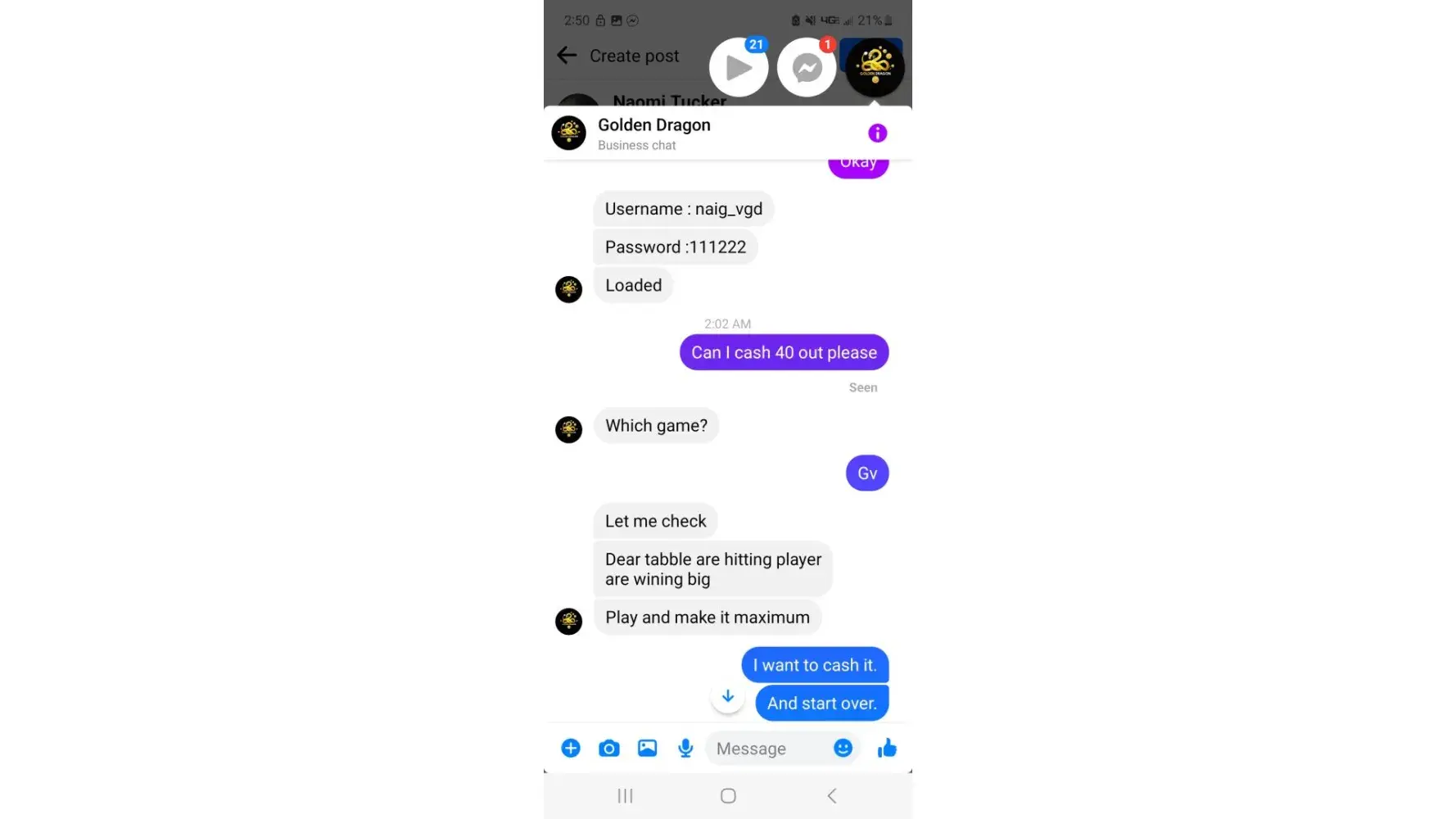 I was playing under Golden Dragon. My username: naig_vgd. I was told my minimum to cash out was 40. I got to 40 and ask to be cashed out. They didn't want to cash me told me to play to maximum. I told them no I need and wanted my money. They finally said okay but then blocked me and cashed my money out. I have pictures showing times and that my money was cashed out. Then I got restricted so I can't message them anymore about my money. Please help