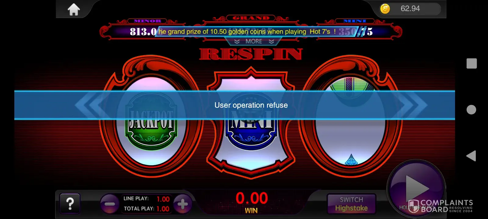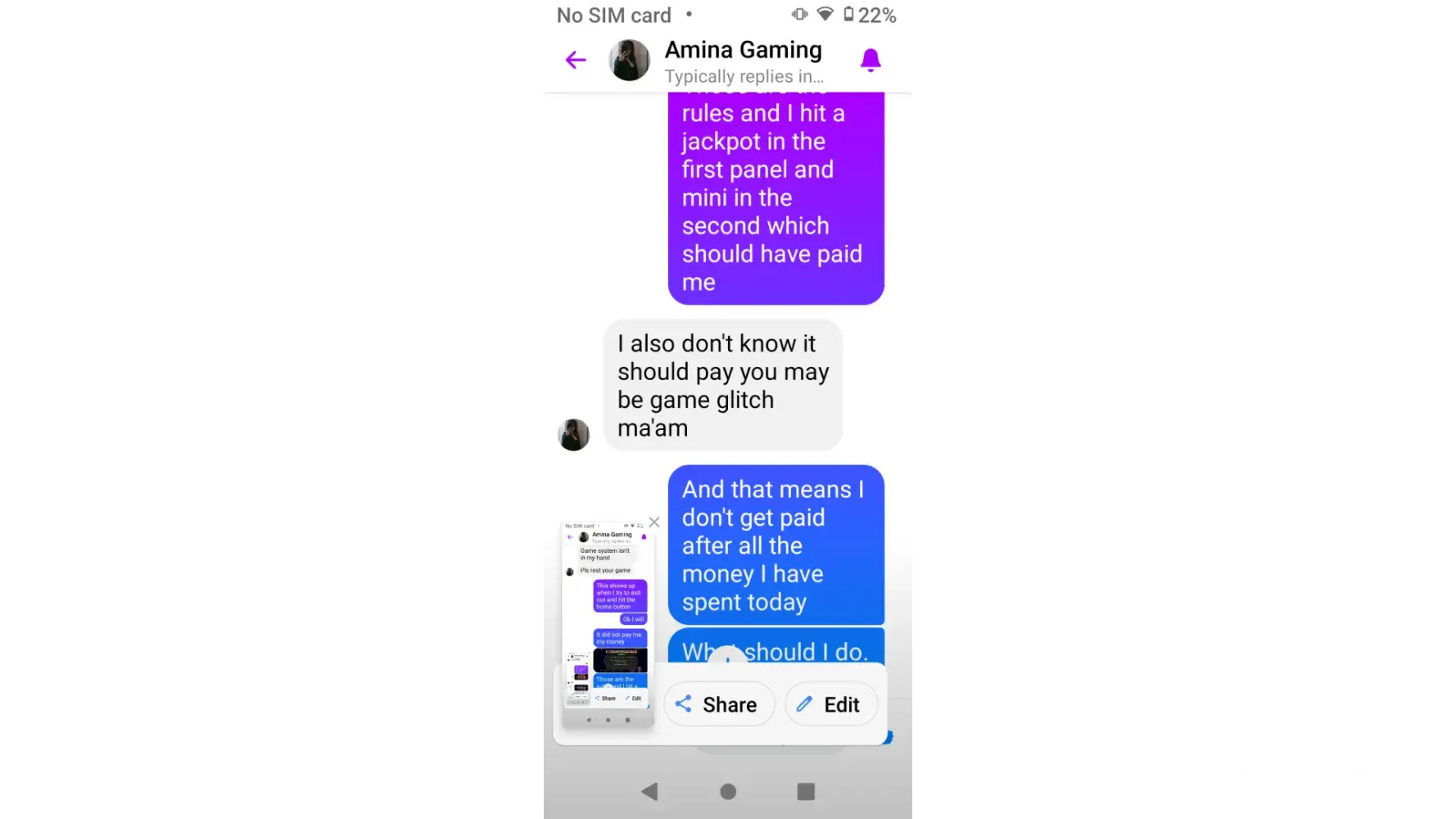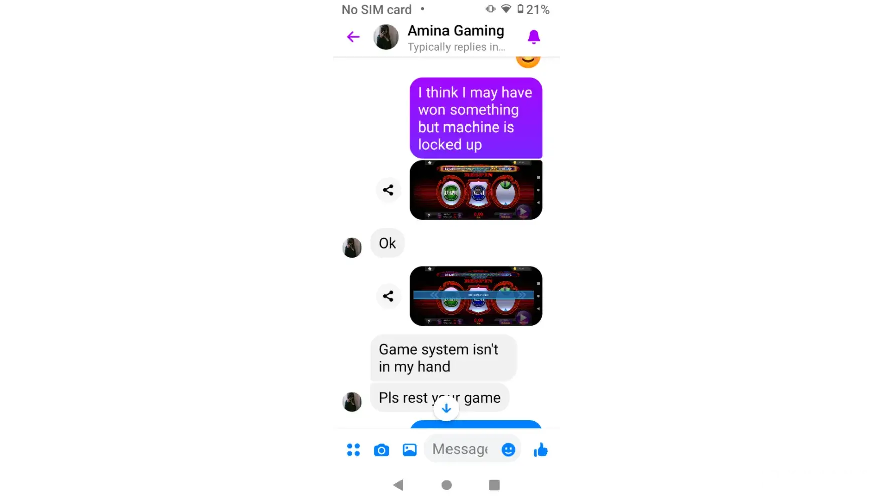 I have played over 1000.00 today and I hit a mini jackpot and was not paid I took screen shots and sent to the person I go through to place my deposits and was told it must be a system error and was offered $5.00 free play.first picture after I hit the middle panel showed the round black circle on it . The second picture I took was when I tried to hit the home button to try to get out of the game and the third picture is the rules where I am entitled to a mini jackpot. The 4th picture shows my same balance as when I was playing and hit the mini jackpot. I closed the game out because I was told to reset the game by the lady who handles my deposits. I also sent my and her conversation to you as well