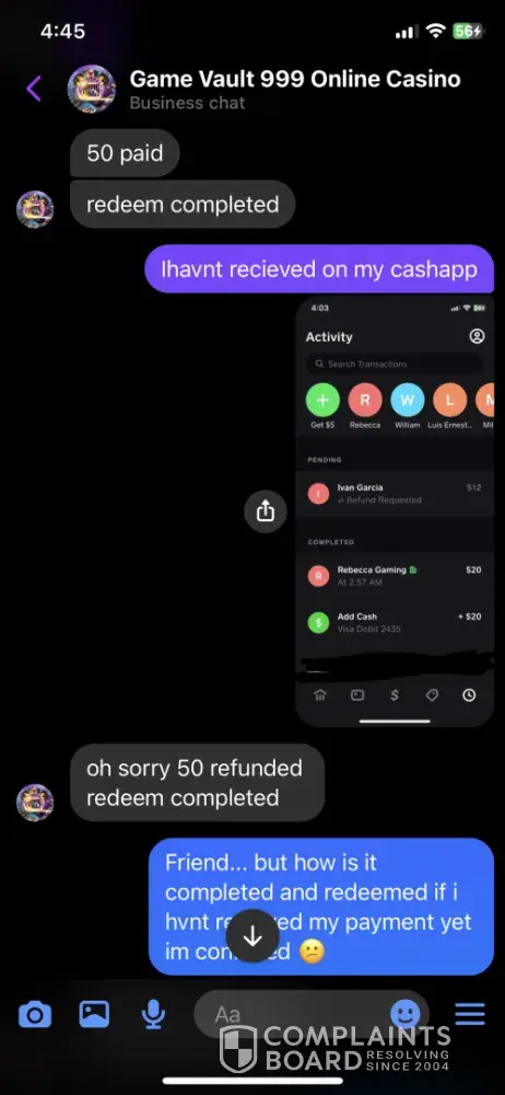 Hello, I had an account with fortune gaming through Facebook Messenger. I sent Victoria Styles $Vict8stly 9.90 dollars through cash app at 1:30 am Dec 21 2023. I never got a response from fortune gaming nor my money sent back on my cash app nor the amount loaded to my game vault account. I never got a response from fortune gaming. Ty