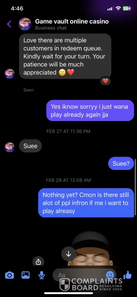 I sent my money to play game over 3 hrs ago and I'm still waiting for it to be loaded if yall a 24/7 casino then there's no way it should take this long I play this game alot I've spent hundreds only cashed out 40 the whole time ...I don't feel like I should wait this long to play