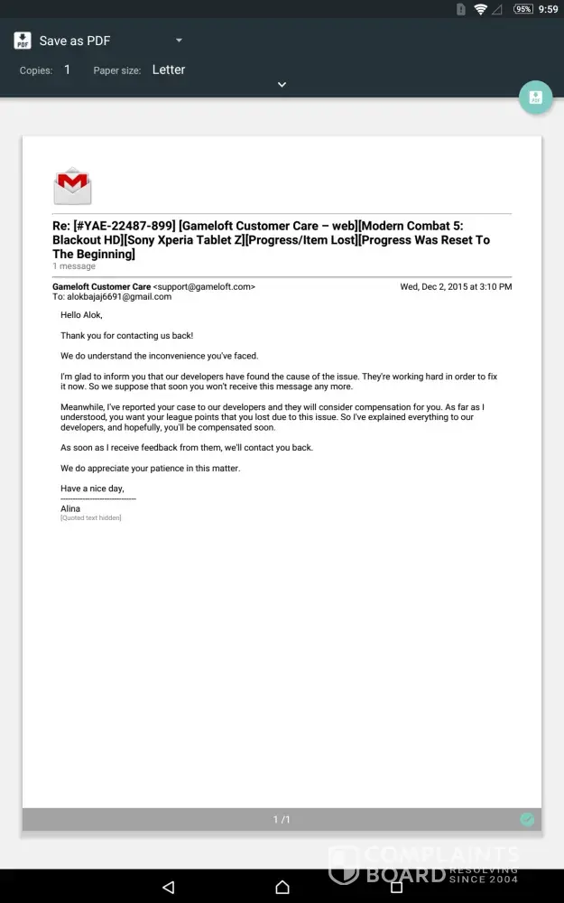 I've attached the screenshots of the emails they've sent me. On the first email they state that they've found the issue that caused me to lose my progress and they are working on it. On the second email, they deny that it wasn't their fault!