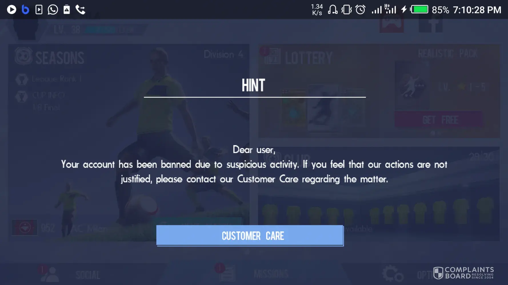 Greetings, while I was playing Gameloft REAL FOOTBALL 2017 I got banned unjustly, saying I couldn't proceed further on the game.