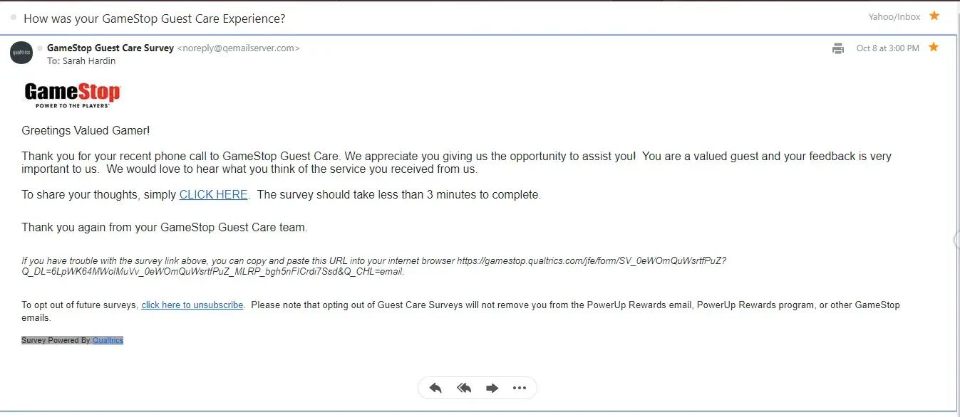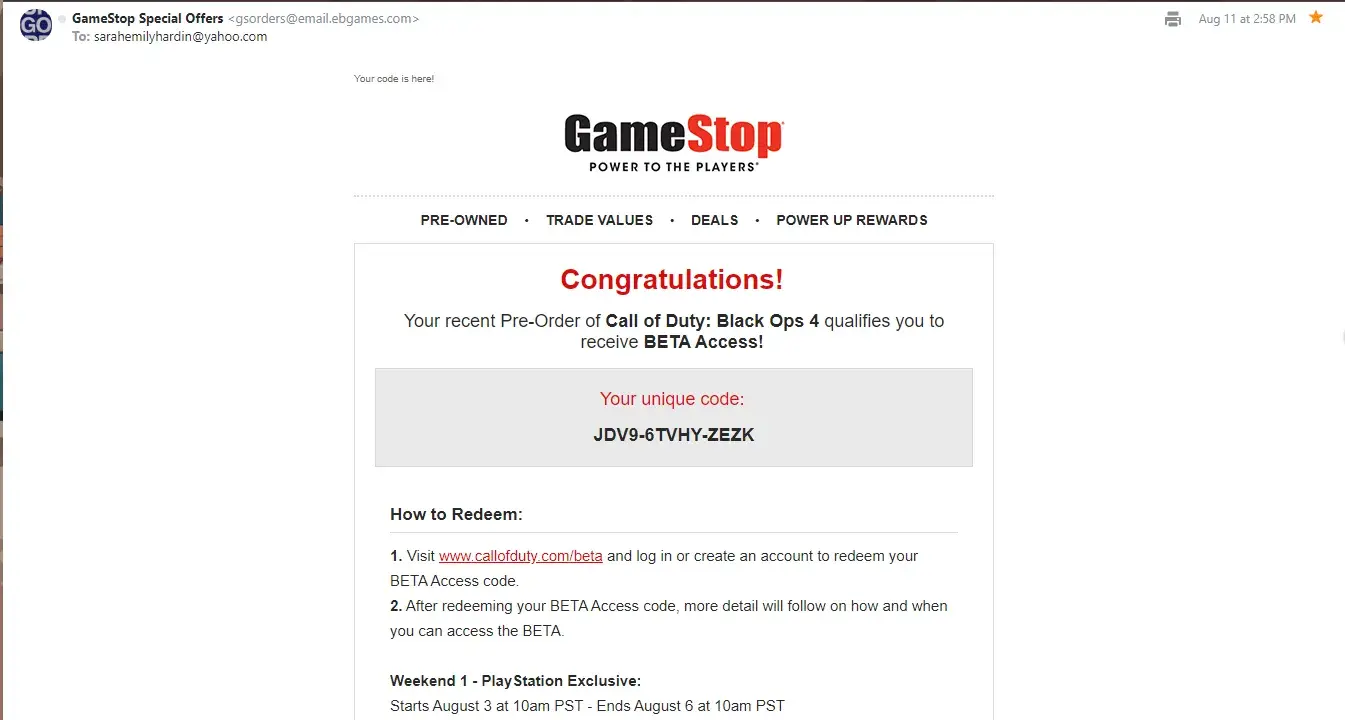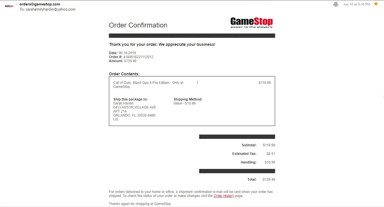 "Thank you so much for pre-ordering Call of Duty: Black Ops 4 from GameStop! Your order # is going to be in your hands before you know it!