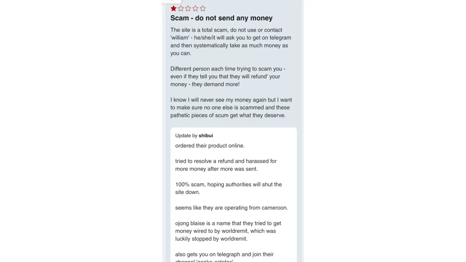 ojong blaise is a name that they tried to get money wired to by worldremit, which was luckily stopped by worldremit.