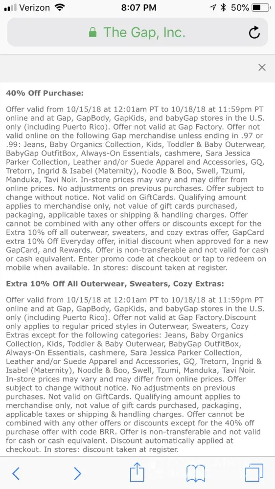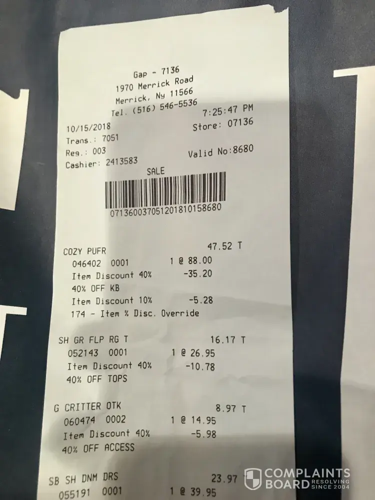 Today I went into a Gap store on Merrick Avenue in Merrick NY Long Island to purchase a coat for my daughter. I had previously seen online that GAP had a 40% off sale plus a 10% off outerwear online and in stores. So I decide I would just go into the store to make my purchase. When I went to the counter to pay for my items the female sales associate offered me the option to apply for the GAP credit card for an additional 10% off which I declined and then told her "there is already an additional 10% discount advertised on the website". She then replied "no I don't think so" which I then preceded to show her the GAP website home page that advertised this promotion and she then asked me if it had a discount code and I replied "No it doesn't however it says in the fine print 10% taken off at register". She then seemed bothered by her expression that I was insistent on an additional 10% discount that none of the associates were aware of. She then called over a male associate and asked him if he was aware of the additional 10% discount and he also replied "no is it a groupon or something" (I've never seen the GAP on a Groupon by the way). I replied "no it's on the GAP website he then asked to read the discount fine print in my phone and then said "it's on outerwear only do you have outerwear?" I said yes it's in the bag that was already packed in the GAP bag by the female associate. He then with an attitude agreed to apply it to the coat. I then left the store feeling like the sales associates were upset I was asking for this additional 10% that I guess they thought I made up. When I arrived at my home I looked at my receipt and to my unpleasant surprise I saw the coat that had a tag for $78 was rang up at $88. I could only feel this was done purposely. Since it was late and store was closed by the time I reached my home I could not go back to disputed the charge. I actually never want to go to that store again after the terrible customer service I received by those two associates. I will send my husband to dispute the charge instead. How can the GAP advertise a discount and the actual store not be made aware! This promotion states it runs from 10/15/19-10/18/18 I suggest this store and it's associates are made aware before other customers are made to feel the way I was. Please see attachments.