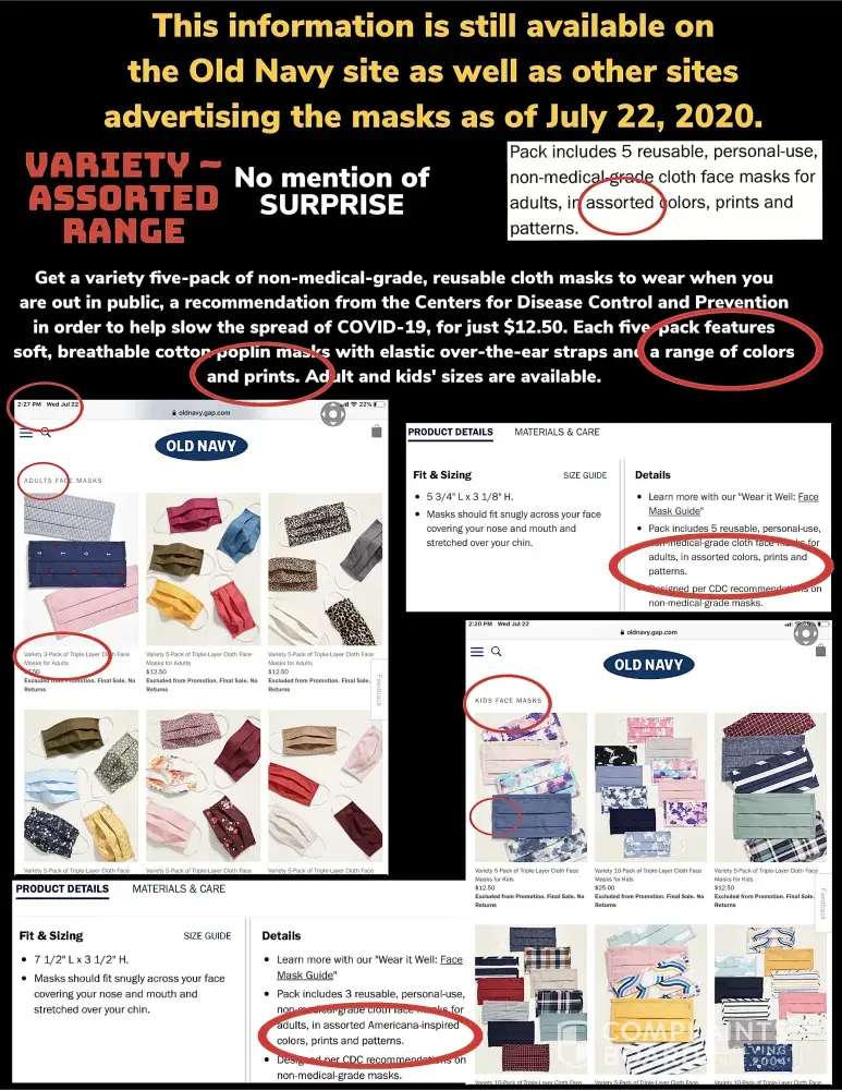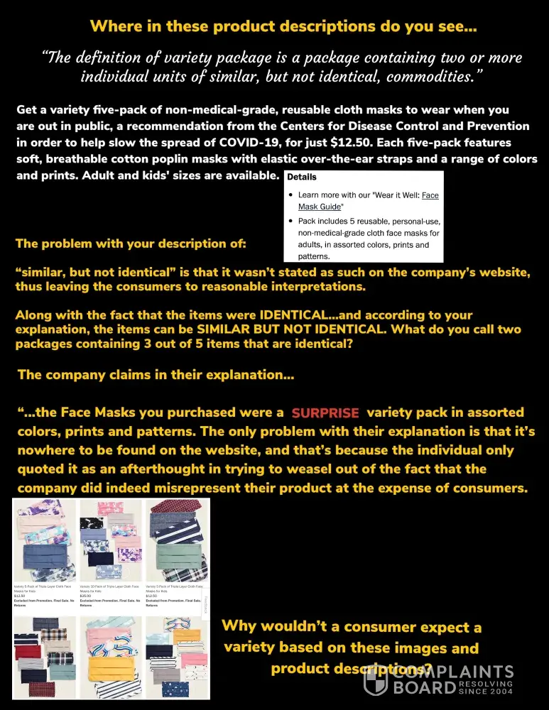 Based on the information above, my expectations were quite legitimate in expecting the pack of masks to all be different. I would not have purchased the products had I had known there would be 3 duplicates out of 5. This fact was quite material to me because the purpose of my purchase was to secure a different mask for my relatives thus avoiding any confusion. Receiving duplicates prevented the use of the masks.