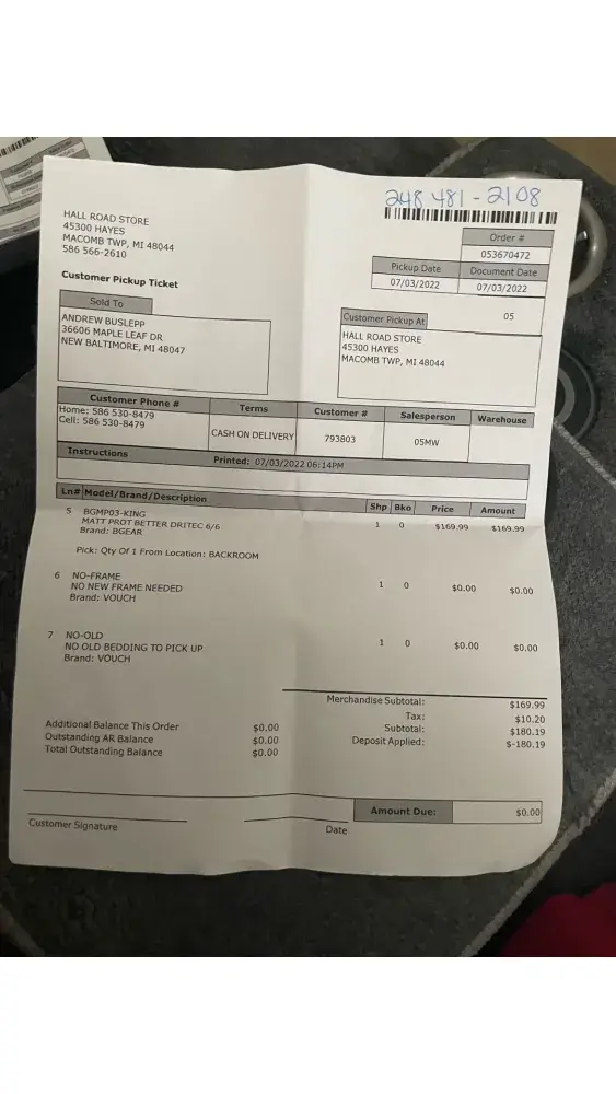 On July 3, 2022 I purchased a Sterns & Foster Lux Estate Cassatt Mattress from Salesperson Mike Whidden at Gardner White Furniture located at Hall Road Store, 45300 Hayes, Macomb Twp, MI 48044.