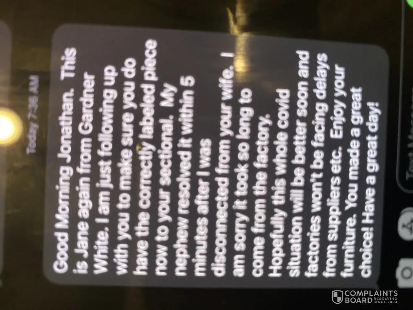 My husband and I ordered a couch mid October for a new home and were told by Jane and the Gardner white location if macomb mi off of Hayes road. She assured and reassured us at the time it would be here no later than late November. 4 months later, we received the couch-with the cuddler on the wrong side. I reached out to Gardner white and spoke with Jenny I...