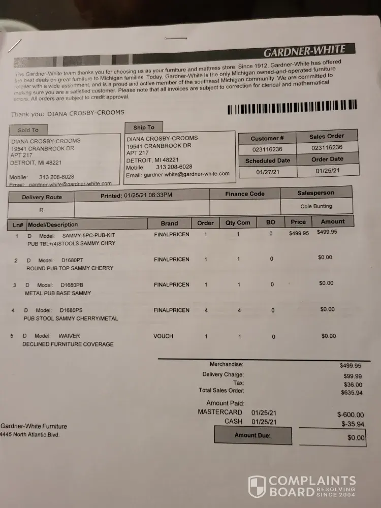 I, Diana Crosby-Crooms-was delivered damaged dining set. Damage was confirmed by representative "Gave" from Gardner White on 02/11/2021... Company promised new table to be delivered on 02/17/2021, but I was hospitalized. Company came to repair damaged chairs on 02/13, but chairs still damaged... Before companies attempts to repair products, I had requested a replacement or refund 2 days after delivery (01/29/2021), and was promised REFUND by my salesman (Cole Bunting). I followed Company policy and responded within 5 day guidelines... I currently being treated for brain cancer and would like this stressful issue resolved. Sincerely, Ms Diana Crooms.