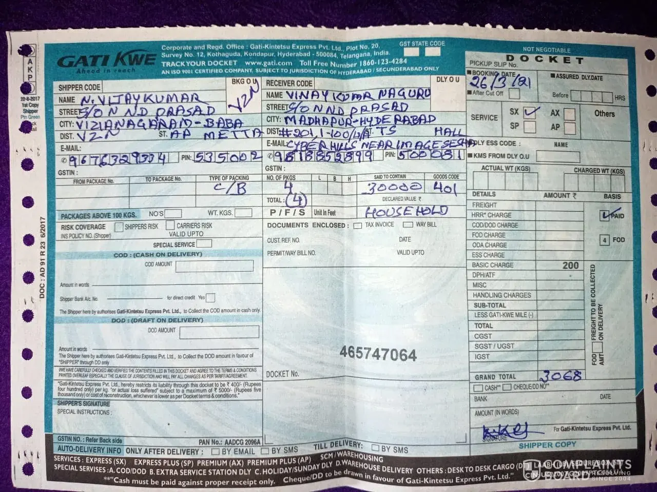 We registered a courier with some house hold items in Gati Services on 26th of March 2021 from Vizianagaram 535002 to Madhapur, Hyderabad 500081.