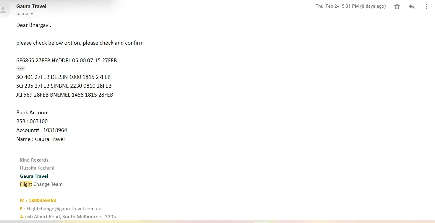 I have booked a ticket flight ticket on 17/02/2022, and immediately I had made a payment. I had sent an email on the same day by attaching the screenshot, the same day I have even contacted gaura travels and they have confirmed the same. While booking the ticket I told the agent that I am pregnant and I can't follow up, because I was already overdue. But, after booking I was calling everyday for the status and update, agents said the same thing that payment was received. I have been in the hospital since 22/02/2022, When I got the baby on 24/02/2022 early morning around 02:00 through cesarean the same day around 15:28, gaura travel team sent an email stating that the flight tickets were sold out they can't be able to provide the same tickets as I have originally opted for. Then I got a missed call, and a voice message, after that I have contacted multiple times by sending emails and calls asking the agents to transfer the call to a flight change team agent who's name is Huzaifa Kachchi, but they never transferred the call and they promised to arrange a call back. After following up multiple times through mails and calls they arranged a call back, and he offered the ticket on 27/02/2022 from Hyderabad to Delhi morning 05:00 to 07:15, remaining all stops are the same, we have accepted for the same but at the end they sent a e-ticket for 26/02/2022 from hyderabad to delhi 10:50 PM to 27/02/2022 01;05 PM on 25/02/2022 at 9:53 PM to travel next day. The e-tickets were sent to me after multiple follow-ups though different communication channels. I have originally accepted the tickets from Hyderabad to Kolkata, kolkata to singapore, and singapore to melbourne with 2 stops and the journey dates were 28/02/2022 to 01/03/2022, but then gaura travel guys called me and changed to 3 stops from hyderabad to delhi, delhi to singapore, singapore to brisbane, and brisbane to melbourne on 27/02/2022 to 28/02/2022, I accepted the same, at the end travel team sent different tickets from 26/02/2022 to 28/02/2022. I already told Huzaifa Kachchi that I had a cesarean and I am in hospital and explained the situation very clearly, even though I told that my mother is a patient and she needs a wheelchair. I told ruksana to arrange a call back but she never arranged a call back. I am having all the conversation recordings and all email proofs of what the gaura travel guys have promised and what the service they provided. Gaura travel guys gave me mental tension and suffered me in my difficult times. I needed my mother urgently so I booked a ticket with other airlines. The amount is $2347 so I need compensation for the same and also I need the whole $1300 that I paid to gaura travels that needs to be refunded to my bank account as soon as possible. Gaura travel agent forced and promised the things to buy the ticket.