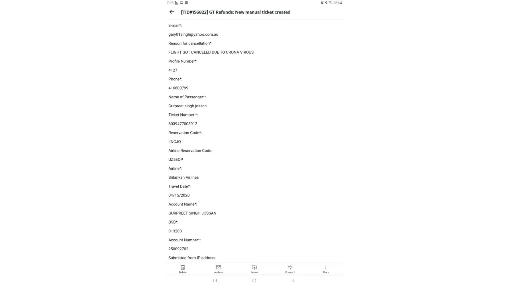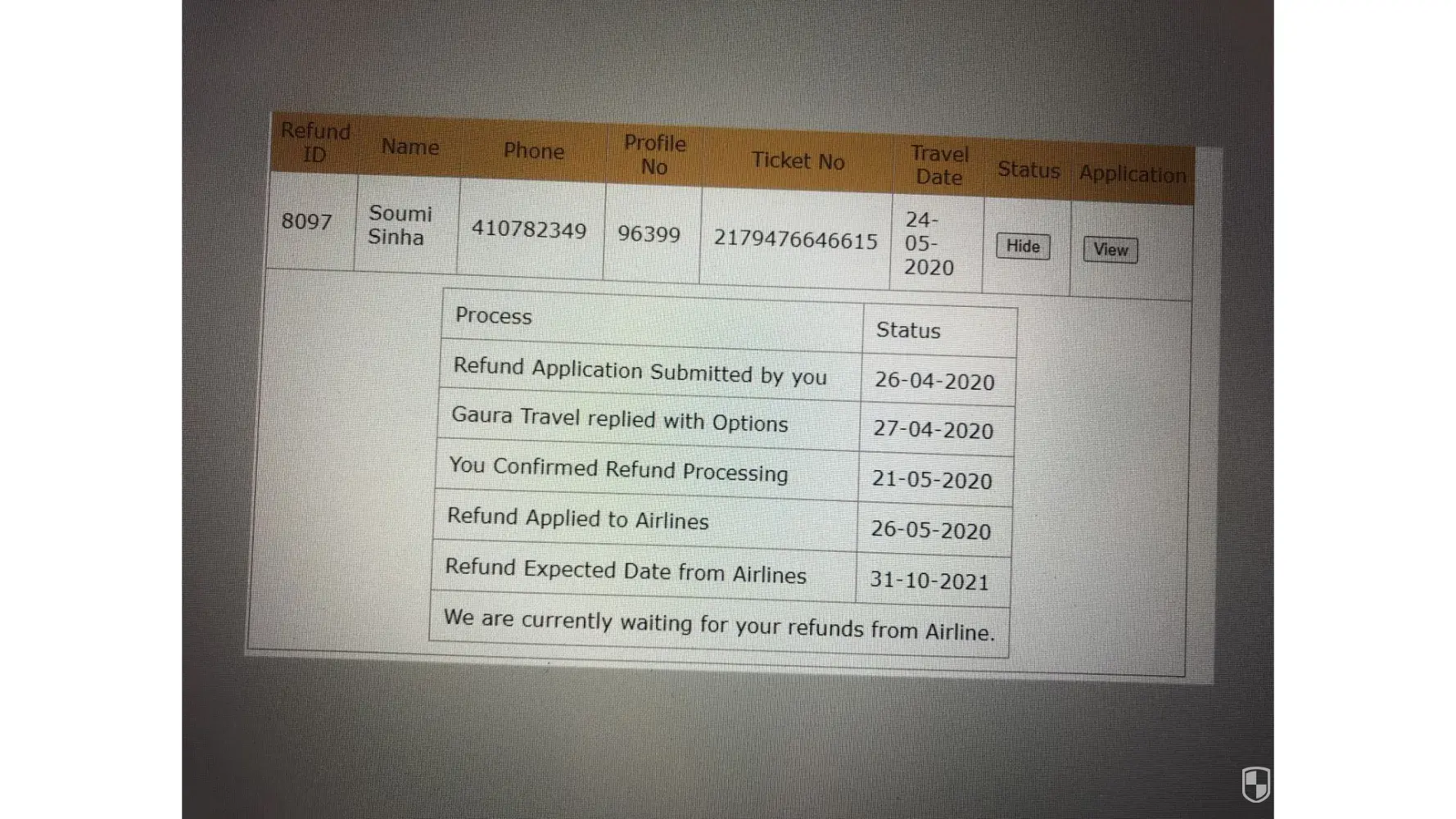 Hi, We purchased a ticket from Sydney to Kolkata in early 2020. Flight was cancelled by Airlines (Thai airlines). A refund application was lodged on 26.04.20 Refund ID 8097 Ticket No: [protected] Last update given on 31.10.21 After that we have no information and we havnt received any refund every after almost 2 yrs Regards Sudip Sinha [protected]@gmail.com [protected]
