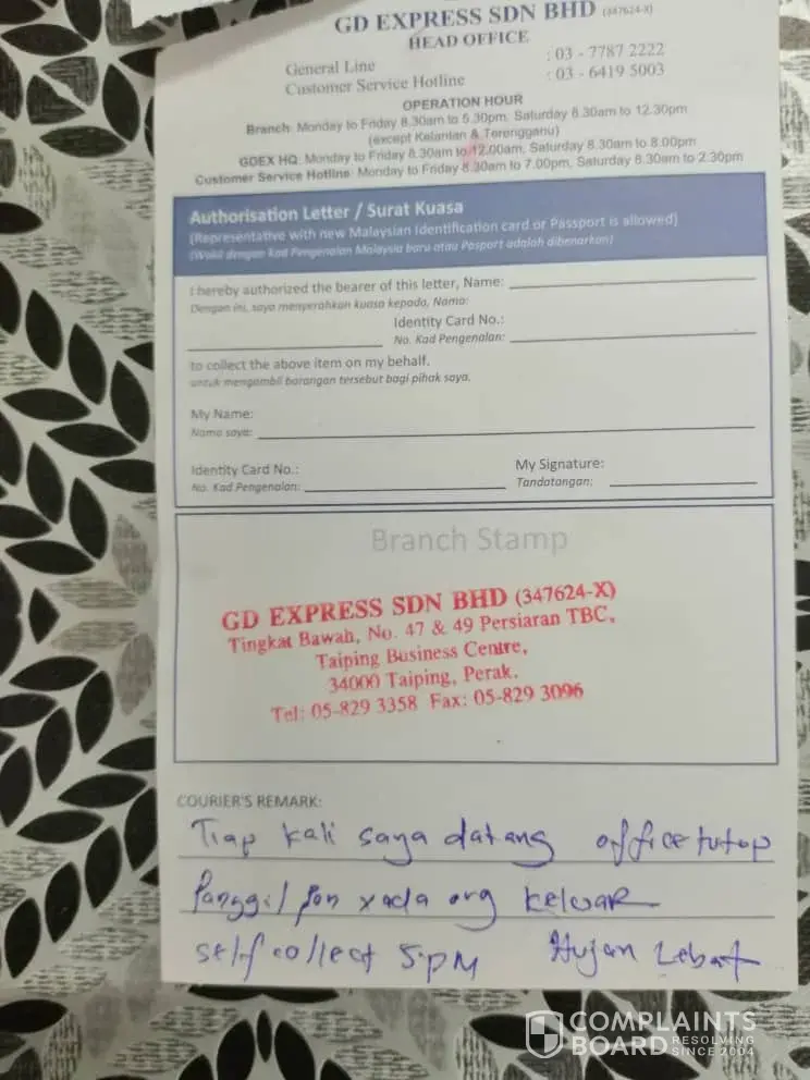 Saya sebagai pelanggan yang menerima barangan dari perkhidmatan syarikat ini berasa amat kecewa dengan sikap pemandu yang menghantar barangan ke pejabat saya.Perkhidmatan ini saya bayar dan bukan nya percuma.Jadi tugas penghantar barang adalah menghantar barang dan bukan nya sebagai tukang komen .Ini bukan pertama kali saya terima note beserta kata-kata yang kurang sopan tetapi kali ketiga. Jadi sekiranya pelanggan tiada dipejabat, anda boleh hubungi no handphone peribadi yang telah terpampang besar di pejabat saya.Atau sekiranya malas nak hubungi no handphone, anda tinggalkan consigment note tanpa kata-kata yang tak puas hati terhadap pelanggan anda.Pejabat saya bukan ada pengawal yang jaga selama 24 jam.Saya selalu bekerja diluar kawasan malah kerani saya pula ada waktu ke bank, waktu makan atau urusan lain di luar pejabat.Pejabat saya setiap minggu ada barang yang akan sampai dari penghantar perkhidmatan lain selain dari gdex.Namun tidak pernah sekali pun saya terima rungutan dari pihak penghantar sepertimana yang saya terima dari gdex.Malah mereka sendiri(penghantar perkhidmatan lain)pun tahu untuk hubungi saya sekiranya tiada orang dipejabat saya.