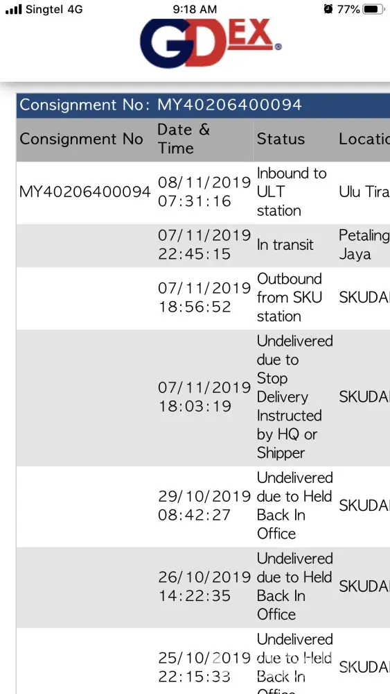 Saya menggunakan service gdex Perlis (tracking number MY66001066031) untuk menghantar buah harum manis kepada pembeli di Taman Sutera, Kajang Selangor pada 17/6/19 ...Dari Gdex tracking buah yang saya hantar itu keluar dari Gdex Perlis pada 17/6/19 jam 19:16:48 petang... Transit ke Gdex Petaling Jaya pada 18/6/19 jam 4:19:28 pagi ... Sampai ke Gdex Tun Hussien Onn (THO) pada 18/6/19 jam 9:15:05 pagi... Saya nak tahu apa sebab yang menyebabkan kiriman saya tidak boleh dihantar kepada penerima pada hari yang sama iaitu 18/6/19 sedangkan buah itu sudah pun berada di THO dari jam 9:15:05 pagi .. Setahu saya alamat penerima (Residences Sutera di Taman Sutera, Kajang) berada tidak jauh dari pejabat Gdex Tun Hussien Onn... apa akan terjadi pada buah itu jika ia berada didalam kotak terlalu lama dengan keadaan ditutup rapat dan siapa akan dipersalahkan jika buah itu rosak... saya siap tulis perkataan " BUAH" dengan besar diatas kotak ... walaupun saya ada tandatangan diatas janji akuan tapi kalau Gdex janji hendak memberi perkhidmatan untuk menghantar barang termasuk"BUAH " ... Gdex juga perlu mengalaskan tanggungjawab untuk MENGUTAMAKAN yang mana perlu dihantar kepada penerima dengan segera untuk mengelakkan sebarang masalah atau kerugian kepada pihak pengirim ... Semoga pihak Gdex dapat menyelesaikan masalah yang saya bangkit ini dimasa akan datang...