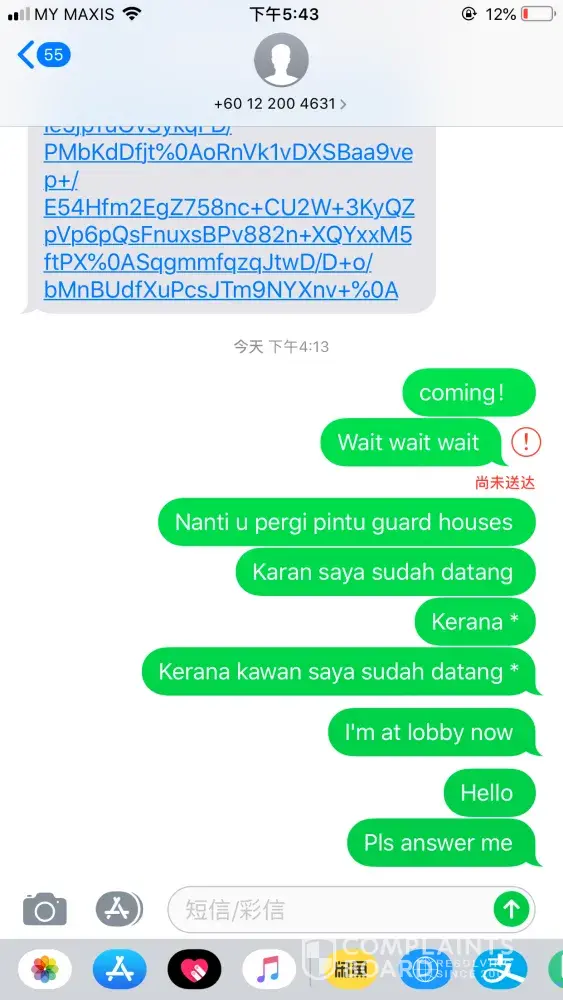 I would like to complain the guys who sending parcel for me, cuz when he arrived my place and wait me within 10 min. But i'm not in house so I told my friends to help me get it. But that guys keep rushing! So he told me he's waiting for a long time, he will go other places 1st than send it back to me. Again! He keep rushing my friends and the lift was slowly, so when my friends go down he already leave. And I call and message him, and wait him for a long time (1hour), it is very irresponsible of him not to answer my call and message. The attitude was very bad and no patience!