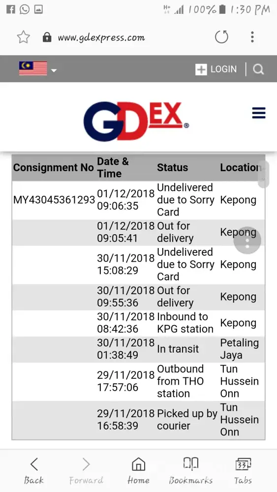 Dear all, I want to complain for "Gdex Kepong Branch" courier services are no responsible to call for infront when can't find receipt ppl and my thing until now haven receipt yet, the courier services are so bad for my track number is MY43045361293! Friday (30/11/2018) i miss collect, but the courier put the slip at my house door only and mention "collect office" at kepong branch. Saturday(1/12/2018) 10am, i come office to collect . Admin told me my thing haven reach there office and say they boy just now morning have delivery again, we also miss collect, admin reason say " we miss out, and house are no ppl".