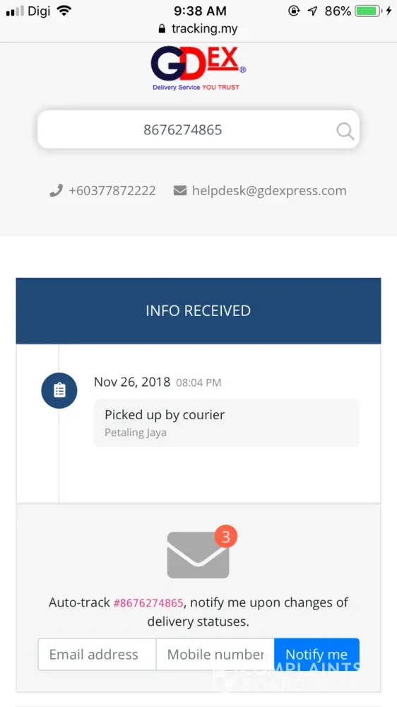 I have made a purchase through Lazada on 27/11/2018. Immediately, the delivery status updated as 'parcel packed and will be handed over to our delivery partner Seller Own Fleet MY'. As I will be away since 30/11/2018, I had attempted to contact Lazada to check the status of my parcel. There was no updates until I received a call from Gdex delivery man on 30/11/2018 that my parcel had arrived. I then requested if I can self pick up on 3/12/2018 which the delivery man said he will arrange for me and the office opens until 9pm.