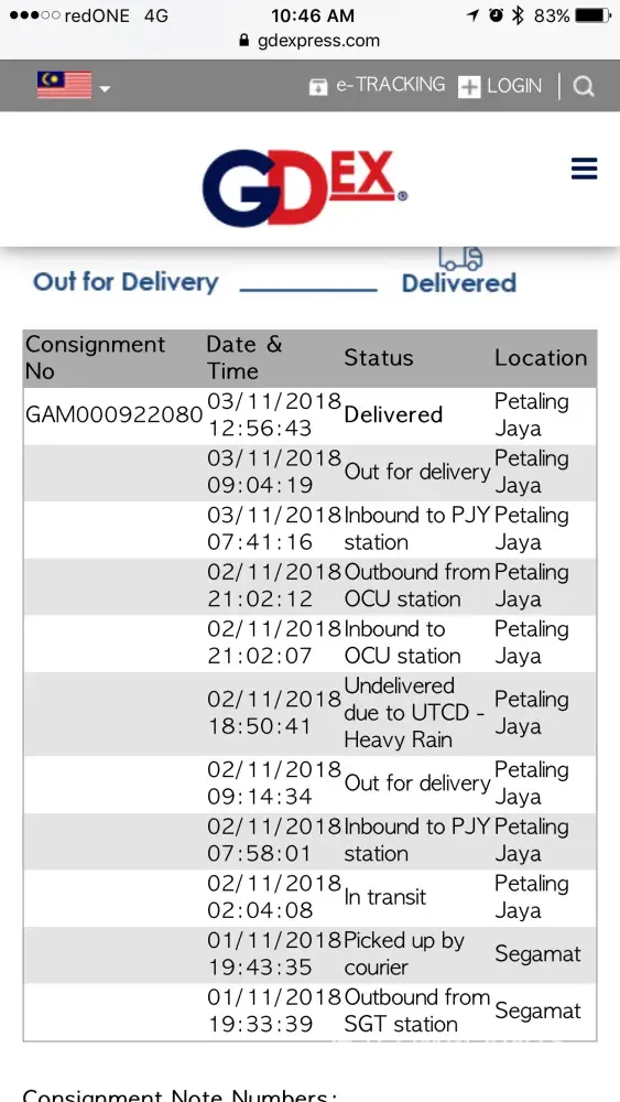 This is not the first time gdex caused me problems. last time I ended up driving to the depot myself to collect my parcel. again, the delivery failed miserably, after several attempts. that time the excuse was that my parcel was too valuable to leave with the guardhouse. they do not trust my guards? well, I do. that's why they work for me. my thanks to the kind staff at the depot, they helped me and located my parcel, even though it was late in the day.