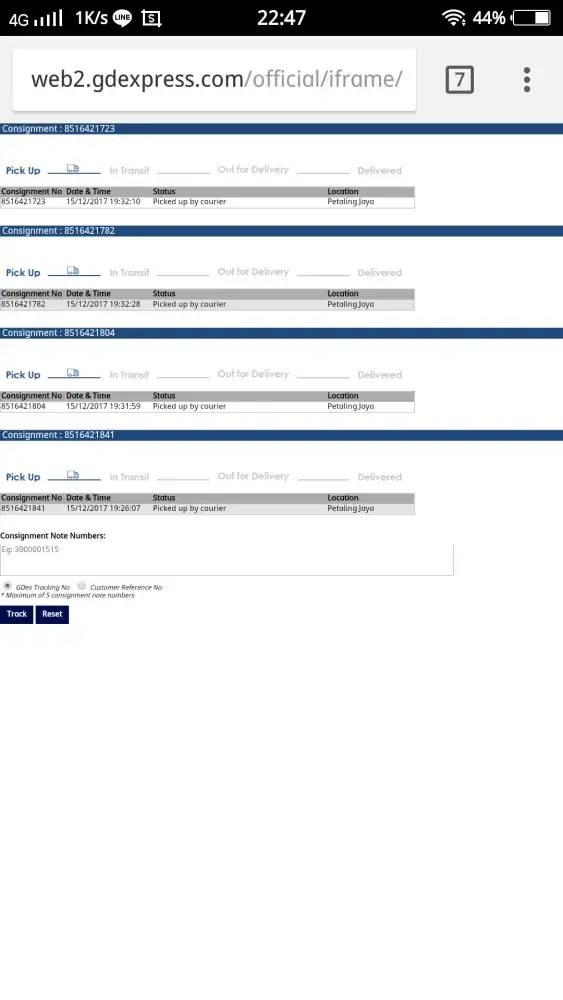 Parcel picked up by Gdex on 12th Dec 2017, but status updated on 13th Dec 2017 morning 6 am, and in transit at Petaling Jaya on 14th Dec 2017, 2 am until 15th Dec 2017 also not update parcel status.