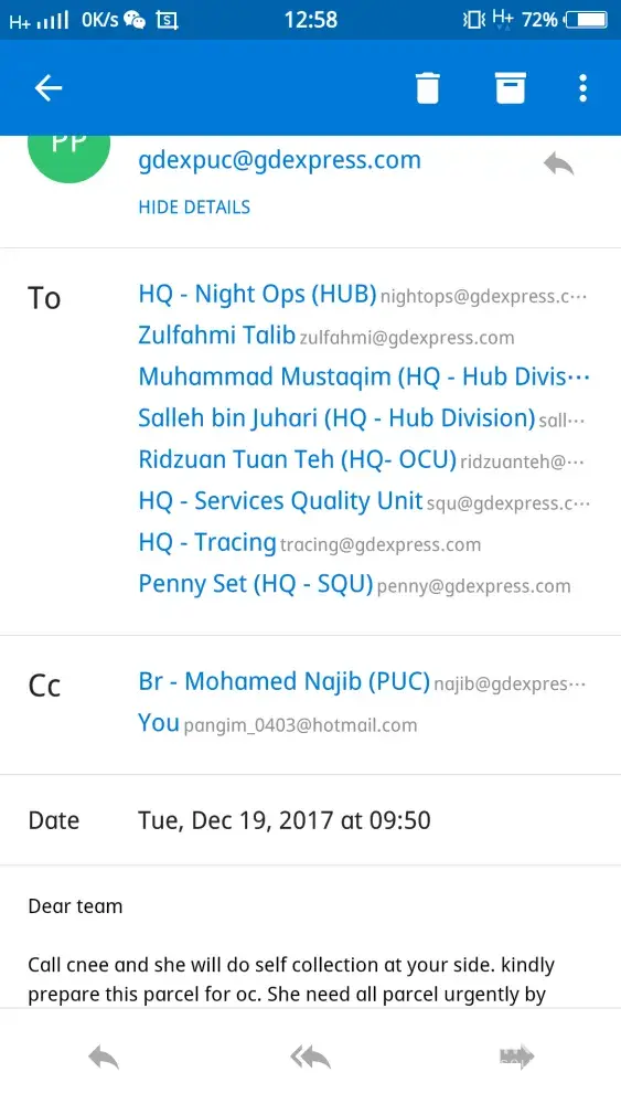 Parcel from gdex e-tracking 10/12/2017 already at pj Inbound to HUB station