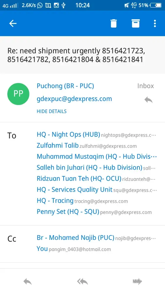And, this delay issue of the shipment (your HQ who deal with my China shipping company-postnbuy &comone express that they do not know where are the exact location of my parcels, dont you think this is just so funny?) and poor call service (called more than 10times very hard to reach them) really make your company looks unprofessional. PEMA, SAFFUAN, MURNA, this three people you may re consider their professional and capability in handling oversea shipment. Yes, I am not your direct customer, but I am your end customer. One more thing, Murna, I have talked to Comone express, guess you will be in trouble soon as you dare to hatred two companies saying that they allow your team to deliver the parcels as long as within 14 days. Also, please study the business law before you speak to me.