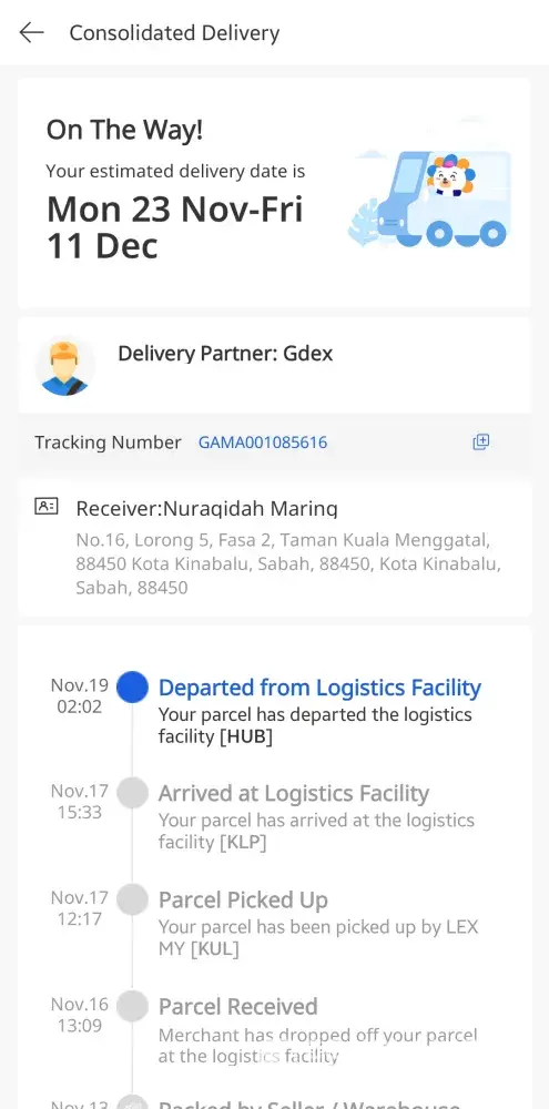 GAMA001085616 this is the tracking number provided at lazada which they stated that delivery partner is Gdex. I need my parcel as soon as possible because I need to use it for my online distance learning.