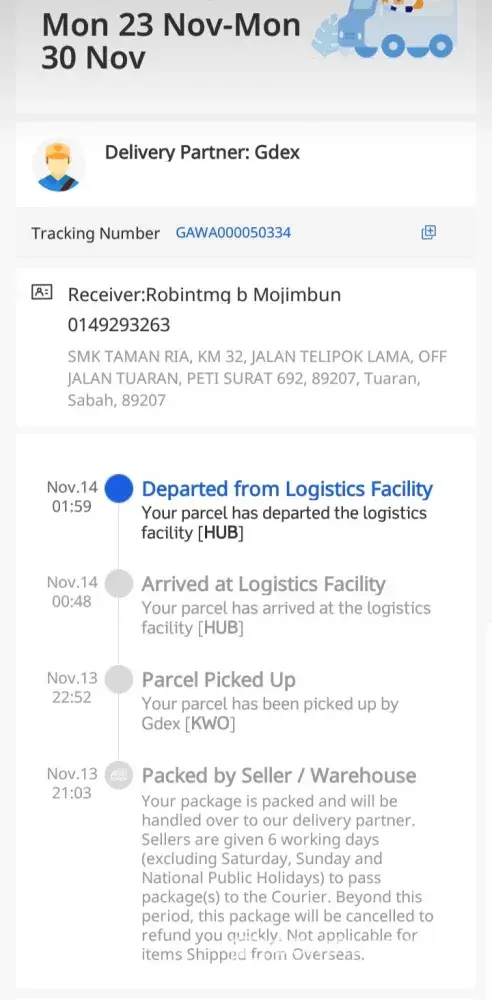 Barang yang saya order pada 11.11.2020 dari lazada. Jangkaan masa yang ditetapkan utk barang tempahan sampai ialah 30.11.2020.. Hari ini sudah 01.12.2020.. Tak tahu la kenapa stuck di logistic facility dari 14.11.2020 hingga 01.12.2020.. Takkan masih tidak sampai2 giliran utk naik flight. Bila call centre gdex, dorang cakap minta kita faham, tapi dorang pun tdk mmahami pelanggan. Saya bayar cas tambang rm9.50 bukannya free. So, cuba ambil tindakan yg sewajarnya..
