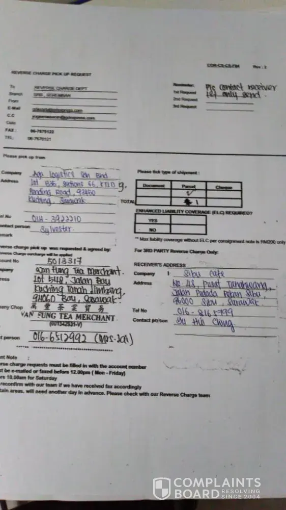 Hai, I am yap ( wan fung tea merchant )from seremban, I sent the reversed charged from 03/10/2019 on thursday to kuching branch, normal take one days. The gdex staff will call my custermer for pick up the items. But until today thats no one follow up my request.Can you check for me, please! what is status now.my number is [protected].