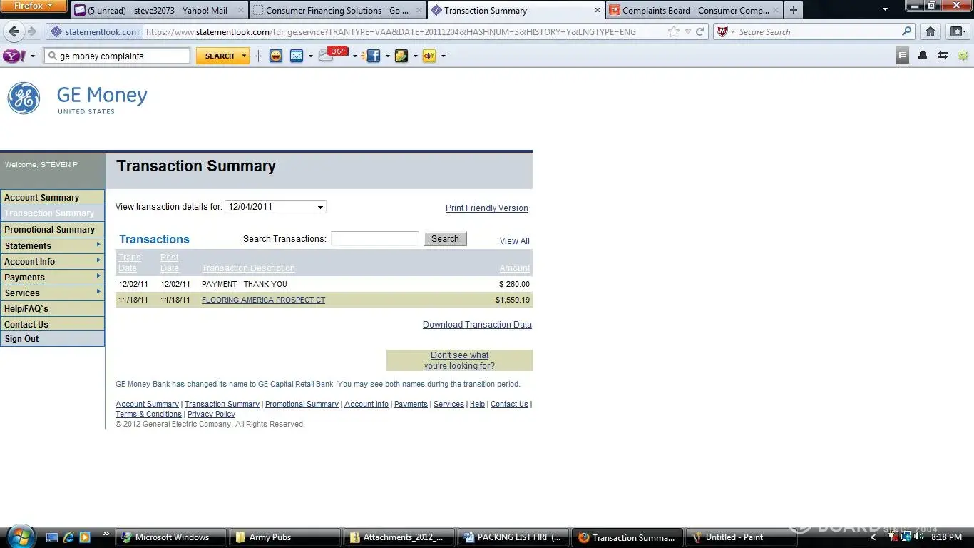 Here is my GE Money complaint. I purchased flooring on 11/18/11 and financed the amount at a promotional rate of 0% for 1 year through GE Money. GE Money then contacted me by mail and offered to set up automatic payments by logging into my account online. Great I thought, I don't have to worry going over the 1 year promotional period.. I logged into my online account, took the total I owed, divided it by 6 to pay it off in 6 months, and set up the first payment for 12/2/11. Note this is less than a month after my purchase. When I set this up, GE Money had yet to send me a bill with my first payment date. On 12/2/12, GE Money withdrew my monthly payment from my account, so I figured I was all set.