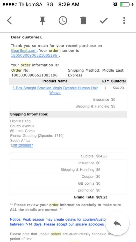 I ordered hair with Gearbest on the 4th of May via Express shipping which suppose to have taken 7 to 14 days to be delivered. I contacted them several times and kept on getting different responses from different agents. They told me to wait until the 21 July, they kept on dodging my question "why do i need to wait for almost 3 months". It is the 25th and still haven't received my parcel, now they want to compensate 40%. i feel if they send my product through safe and correct shipping and on time my product would have arrived safely.