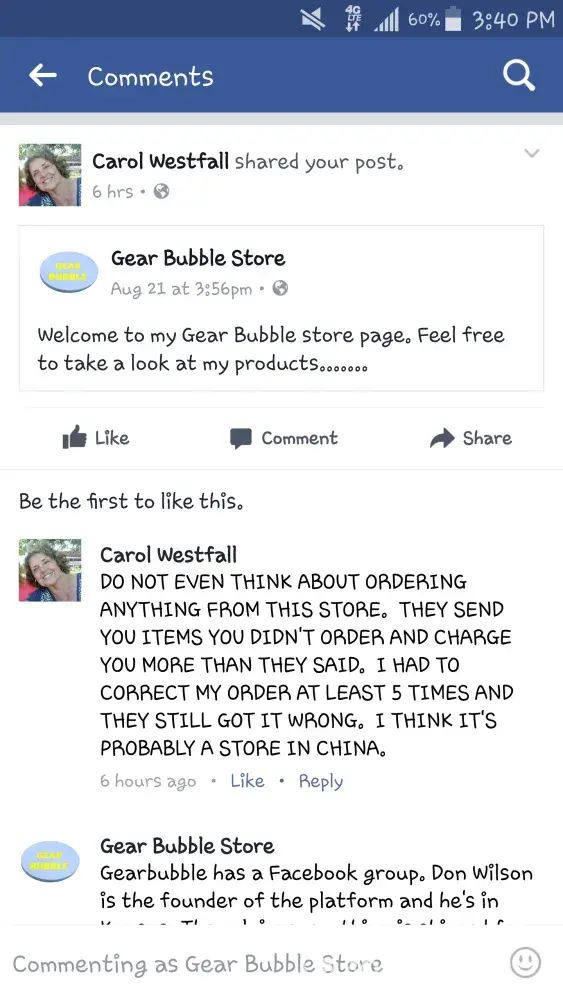 I was also a member of the group on Facebook. I posted a legitimate question on how to deal with complaints about products and items being wrong or late in terms of shipping. Well, I thought they were located in Kansas which is where the founder is located, so I responded to an angry person on Facebook who shared a post on my gear bubble page, to contact gear bubble directly at [protected]@Gearbubble.com with any problems and mentioned that the founder was located in Kansas because I thought his company was also. I was then informed by the founder (Donald Wilson), through a comment in the Facebook group, that my page's name was confusing to people and to send them to the customer service email. Well I did so and I also changed the name of my page so people would not be confused. Apparently he saw my comment to the angry customer and the next day (today December 22nd), he again commented but said what I did was "uncool"by giving his location to a customer and claimed he had given me one chance to fix things, then removed me from the Facebook group. I could not respond so I am posting this complaint. By pulling a ##### move like that, I blocked him on Facebook, deleted my Gear Bubble Facebook page and emailed Gearbubble to delete my seller account. I will NEVER have anything to do with that company ever again and I advise any one else to stay away from them. From the looks of other complaints here, I am justified in feeling this way because the founder was butt hurt and responded to me the way he did. I tried to legitimately sell through his platform and ask a real question but was met with bull####. Well #### Donald Wilson and Gear Bubble. Please feel free to share every complaint you find about this worthless company. You're better off buying or selling through a different platform.