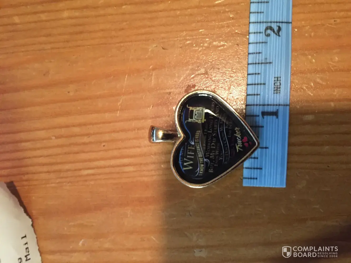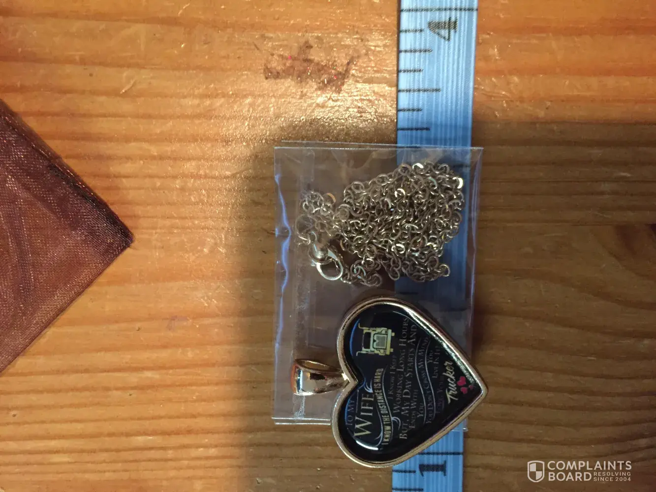 I am very disappointed with this product as it is very hard to read the inscription the chain is not the one advertised and looks to be of very low quality. I ordered it on November 30 and have just collected it from the post office January 4. I also had to pay £14:73 customs charge which I believe you should have known about and taken into consideration. This was meant to be a Xmas present and I was very disappointed not to be able to give my wife a present. I would like a full refund or at least the custom charge. I will not be buying anything more from you.