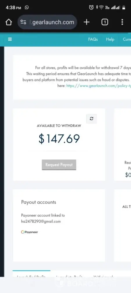 I earned $210.20 profit from actual customer orders on my GearLaunch store (printmytusa.shop). After the store was closed, my earnings have been left in “request†status and have never been paid out.