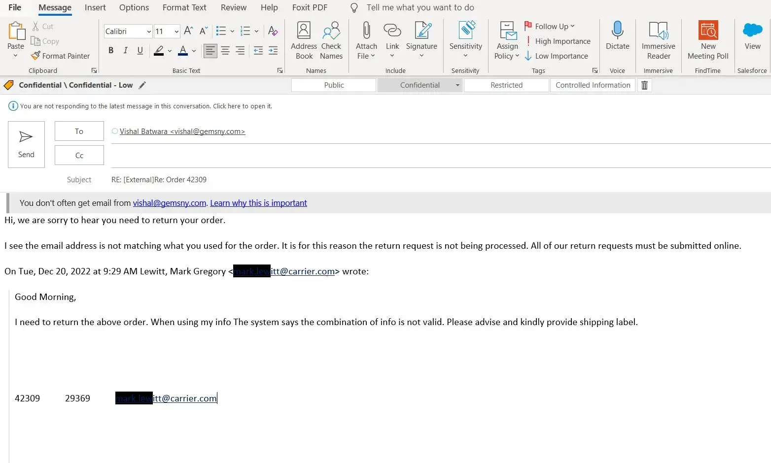I filled out the requested information to include order number my email address and zip code. Mysteriously the system stated that the info did not match. When emailing Gems NY the representative stated that the email address I used did not match and returns could only be done via online process.