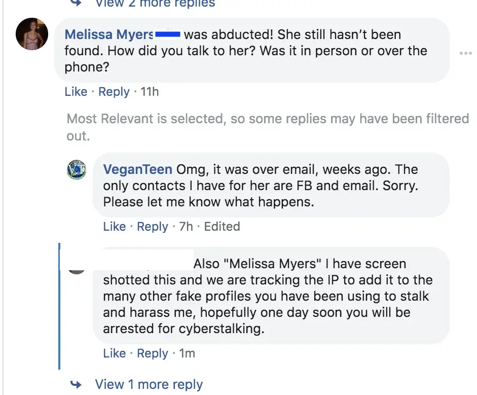 Prior to this Genelle has used the fake names on facebook of Melissa Myers and Anne Summers to befriend everyone who knows the teen activist and then post all kinds of slander like the teen has been killed by her mother, the teen has been abducted, the teen is in [redacted] the teen is a [redacted], etc.